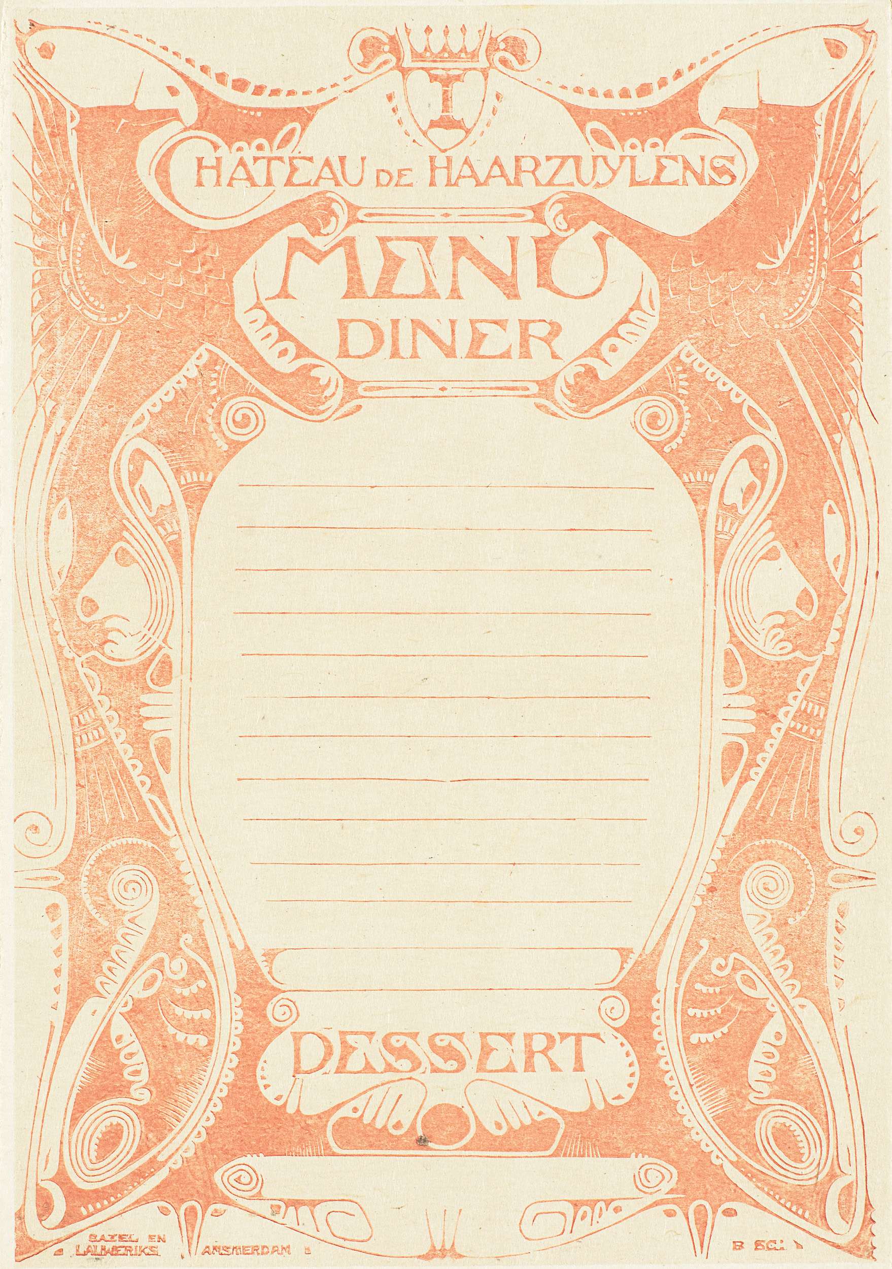 Menu- en dessertkaart voor Kasteel de Haar bij Haarzuilens.
