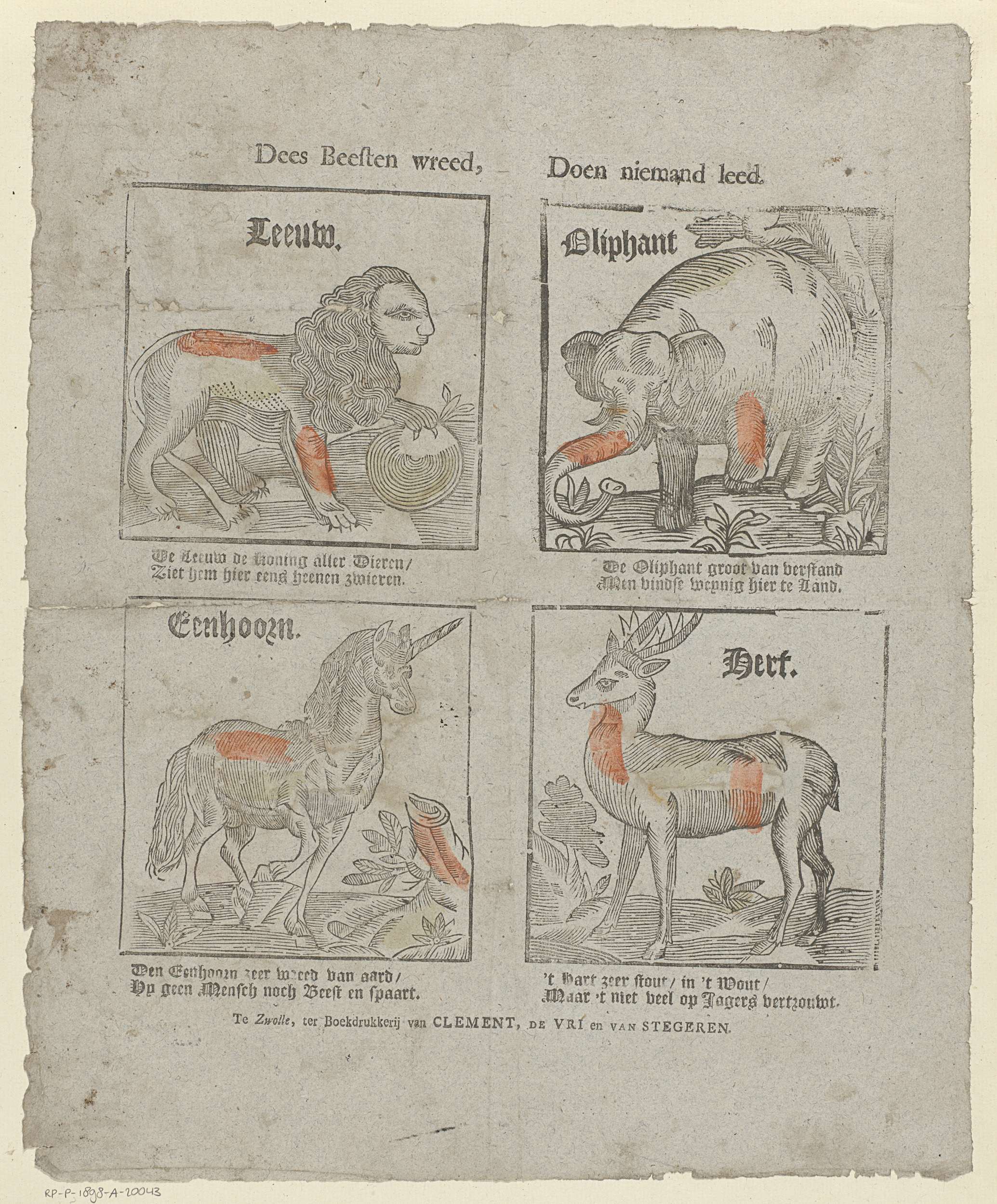 Blad met 4 voorstellingen van dieren: een leeuw, een olifant, een eenhoorn en een hert. Onder elke voorstelling een tweeregelig vers.