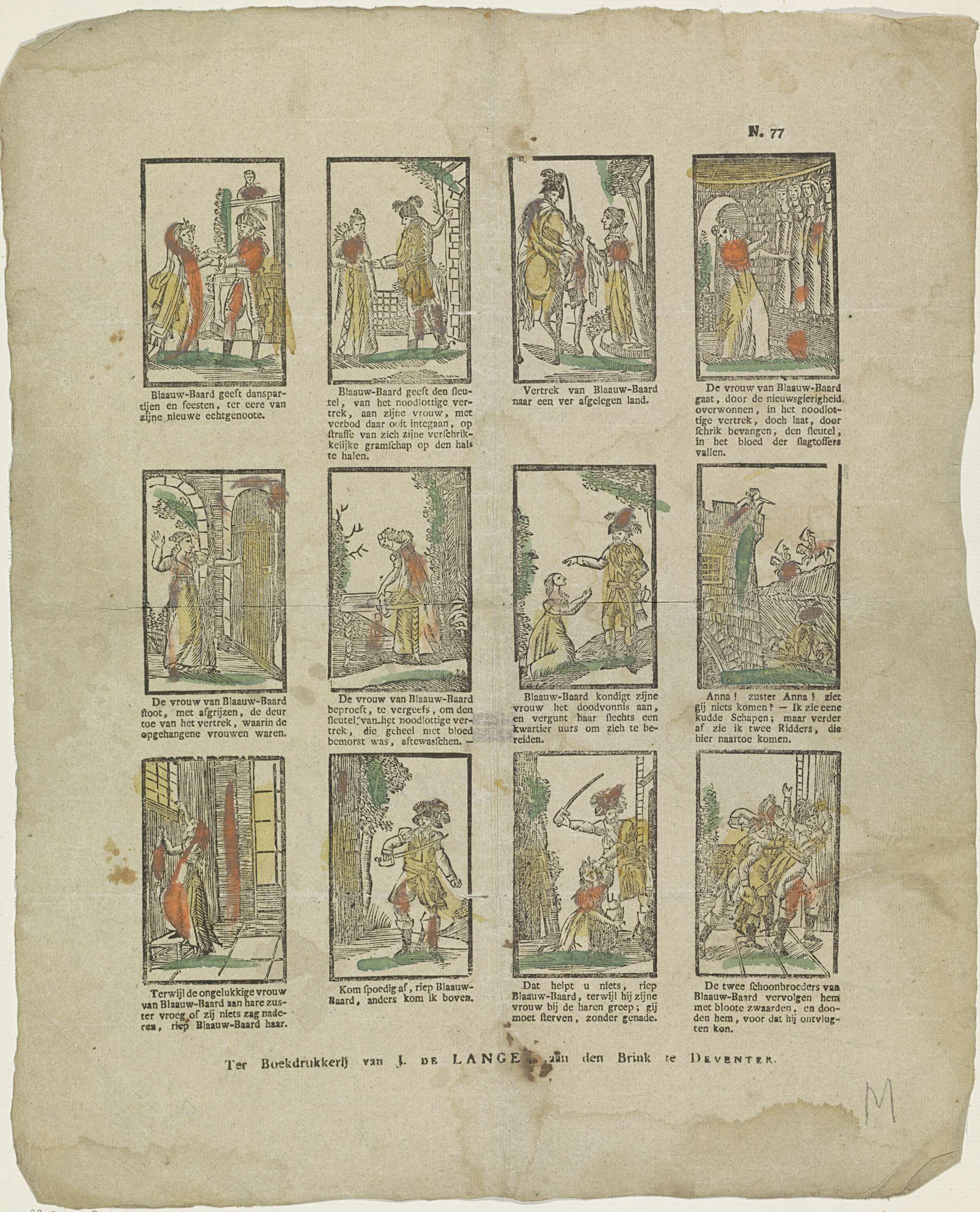 Blad met 12 voorstellingen uit het sprookje van Blauwbaard. Onder elke afbeelding een onderschrift. Genummerd rechtsboven: N. 77.
