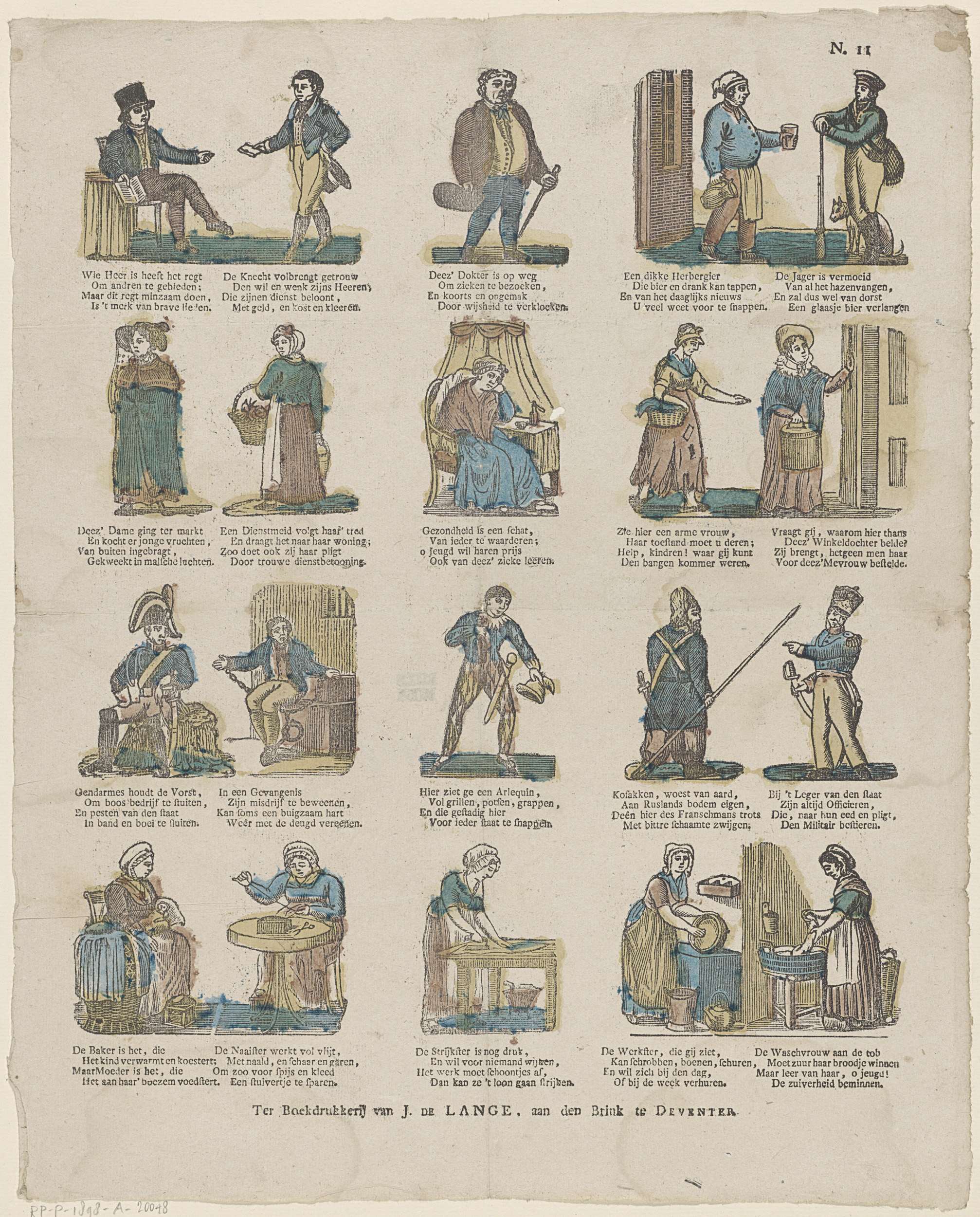 Blad met 15 voorstellingen van verschillende beroepen en bezigheden voor mannen en vrouwen. Onder elke figuur een vierregelig vers. Genummerd rechtsboven: N. 11.