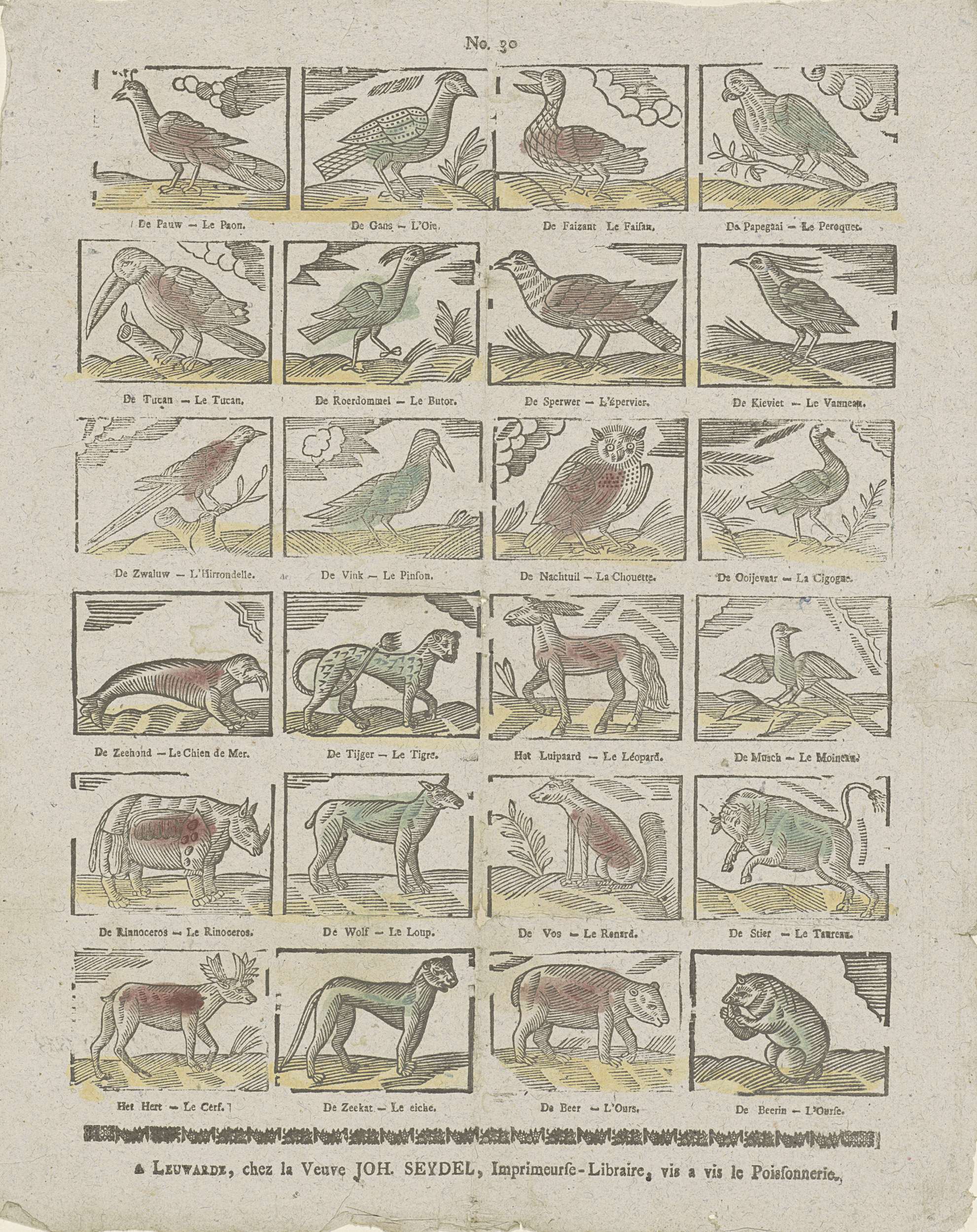 Blad met 24 voorstellingen van dieren, waaronder verschillende vogels, een zeehond, een neushoorn en een beer. Onder elke voorstelling een onderschrift in het Nederlands en in het Frans. Genummerd midden boven: No. 30.