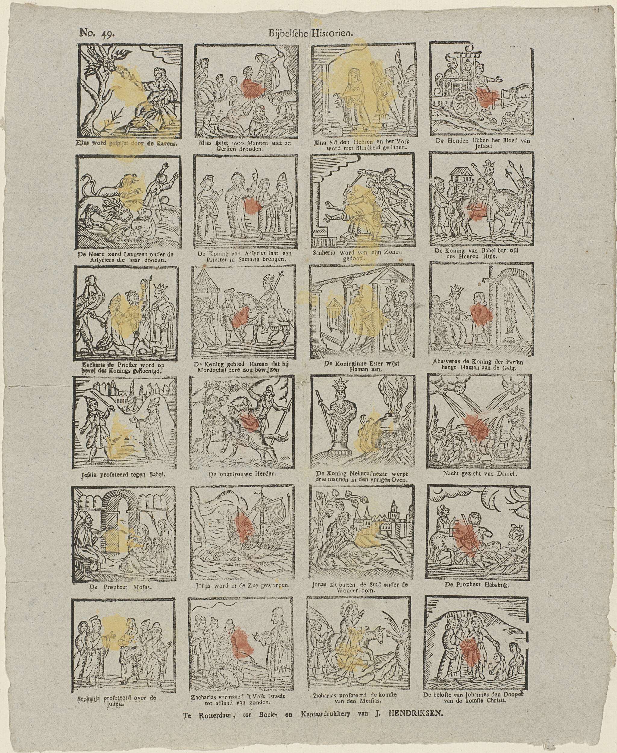 Blad met 24 voorstellingen uit het Oude Testament, zoals de honden die het bloed likken van Izebel, Sanherib die door zijn zonen wordt gedood en koning Nebukadnessar die drie mannen in de vuuroven werpt. Onder elke afbeelding een onderschrift. Genummerd linksboven: No. 49.
