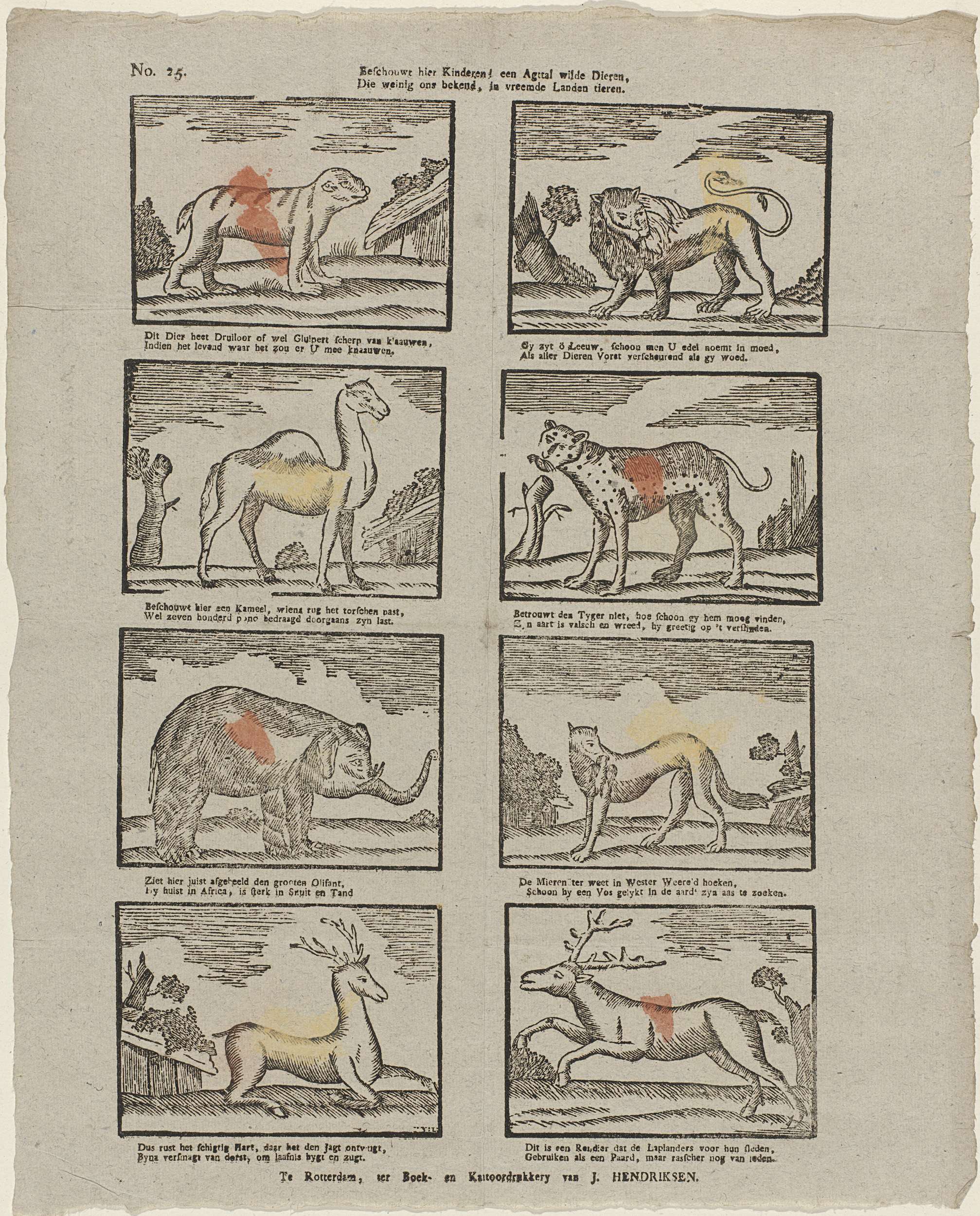 Blad met 8 voorstellingen van dieren, zoals een kameel, een olifant en een rendier. Onder elke afbeelding een tweeregelig vers. Genummerd linksboven: No. 25.