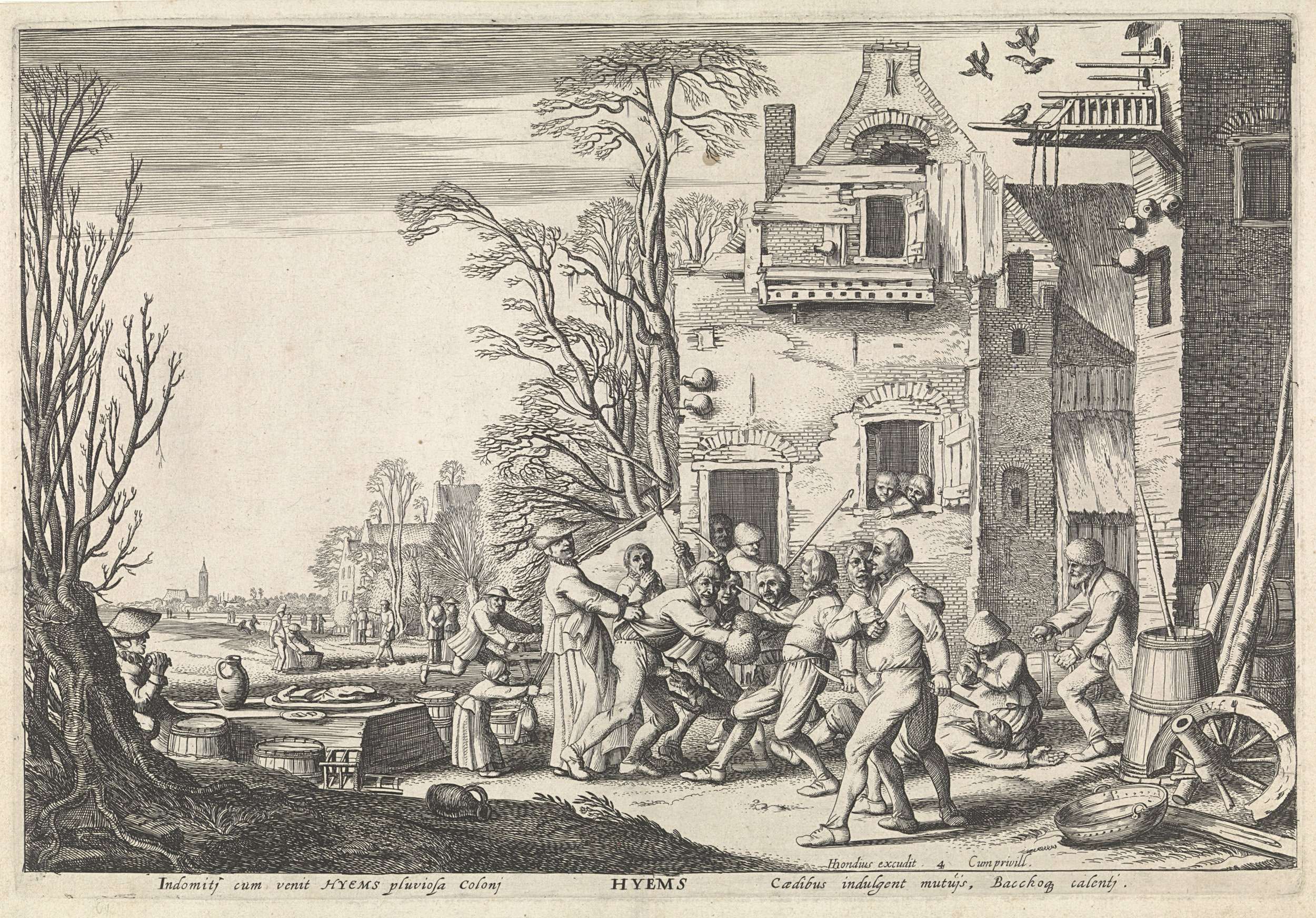 Vechtende boeren voor een huis. Verbeelding van het jaargetijde winter, vierde prent van een serie van vier.