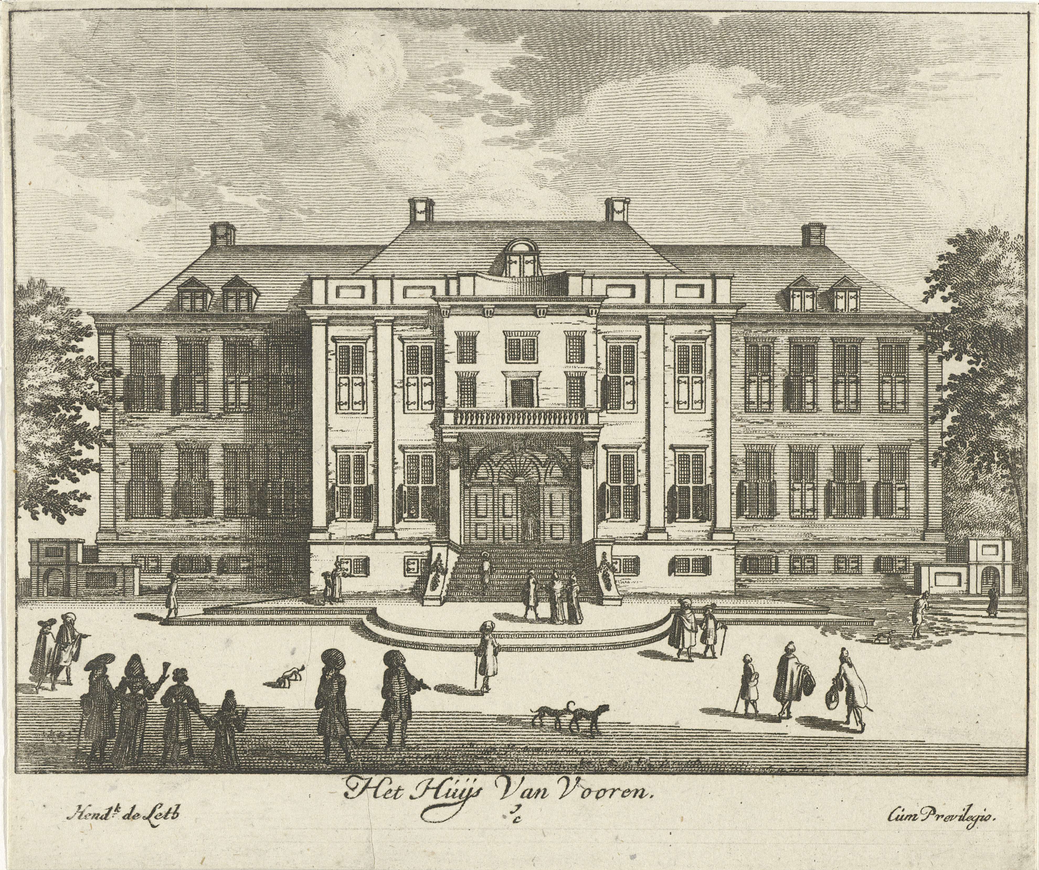 Gezicht op de voorgevel van Paleis Soestdijk met wandelende figuren op de voorgrond. De prent maakt deel uit van een serie met zestien gezichten op Paleis Soestdijk en het bijbehorende landgoed.