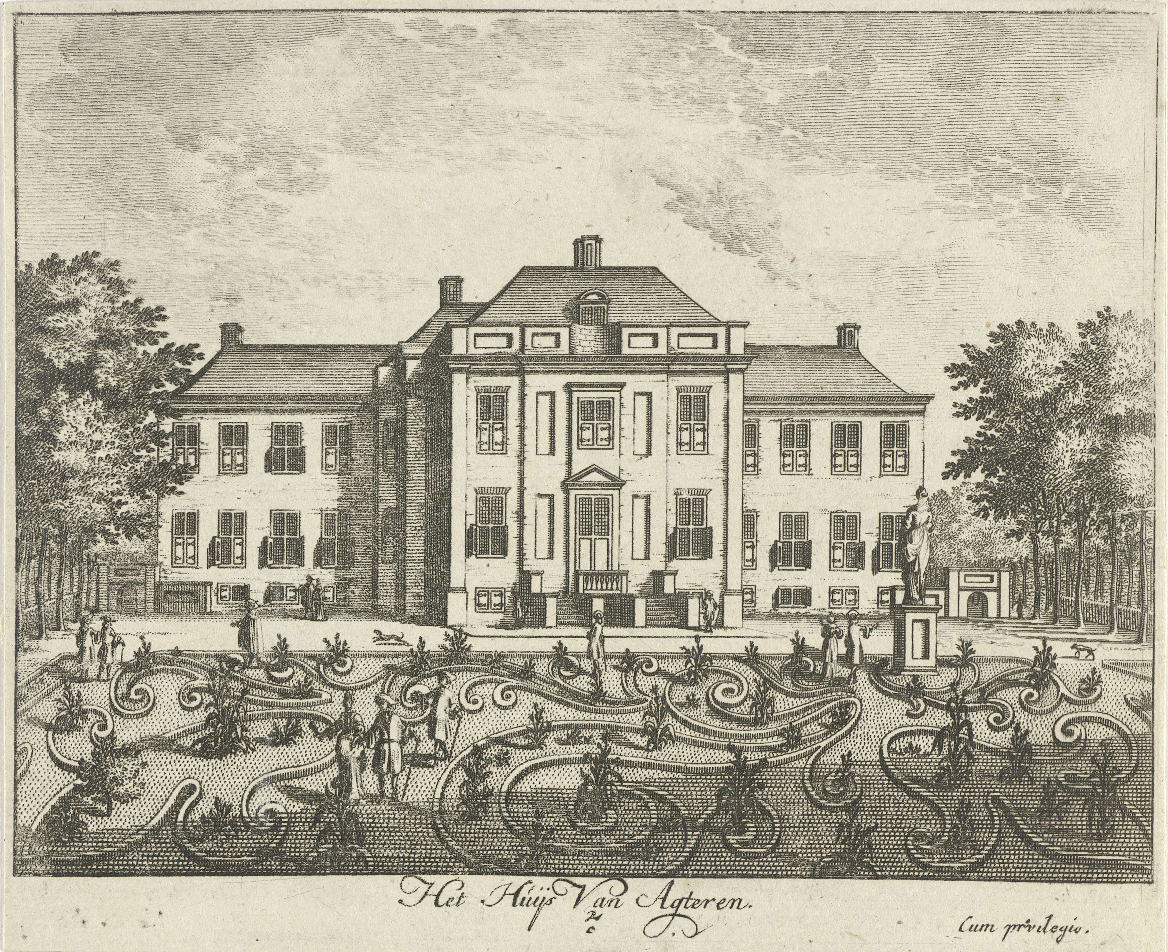 Gezicht op de achtergevel van Paleis Soestdijk met wandelende figuren in de aangelegde tuin. De prent maakt deel uit van een serie met zestien gezichten op Paleis Soestdijk en het bijbehorende landgoed.