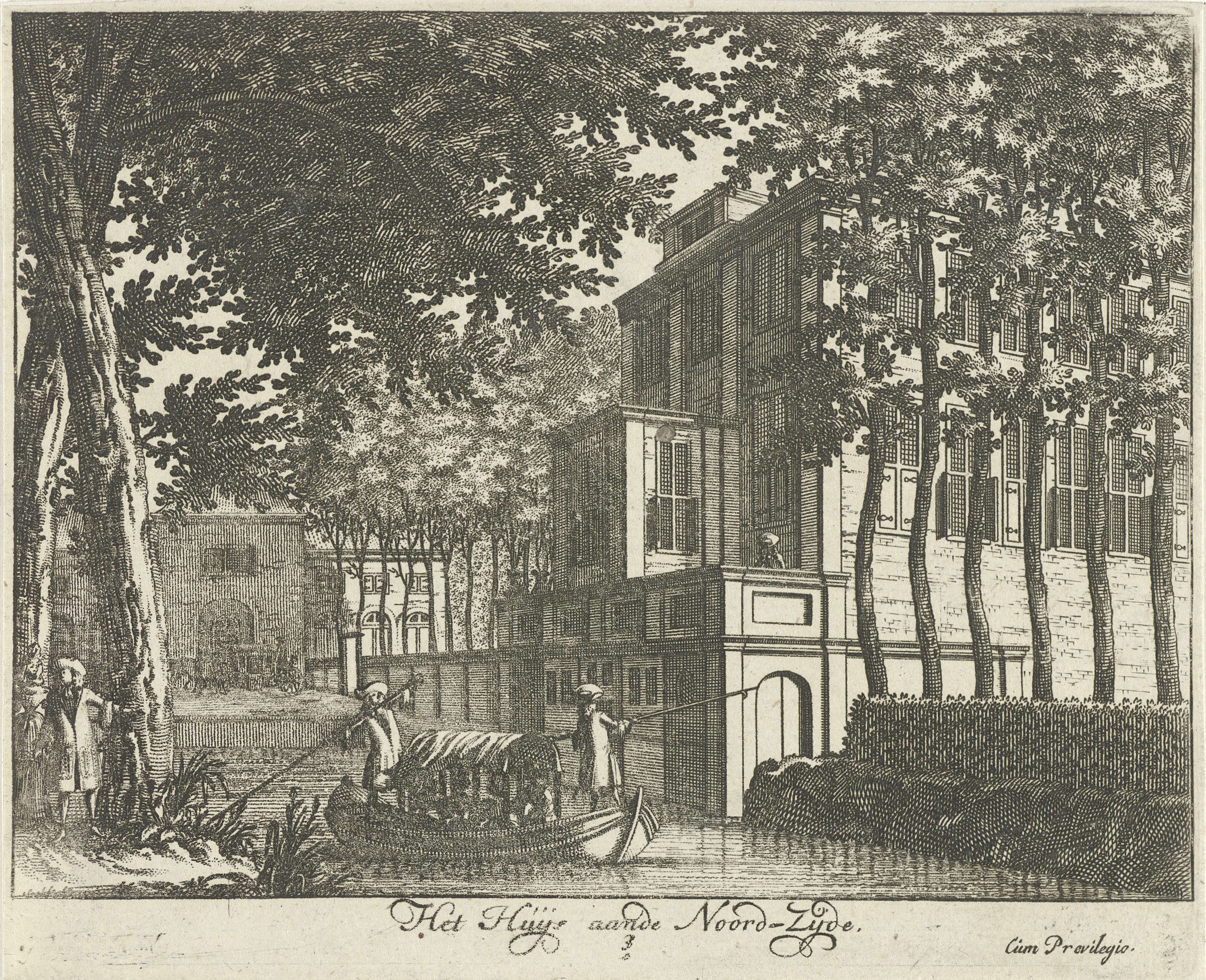 Gezicht op de noordzijde van Paleis Soestdijk met op de voorgrond twee staande figuren in een boot op het water. De prent maakt deel uit van een serie met zestien gezichten op Paleis Soestdijk en het bijbehorende landgoed.