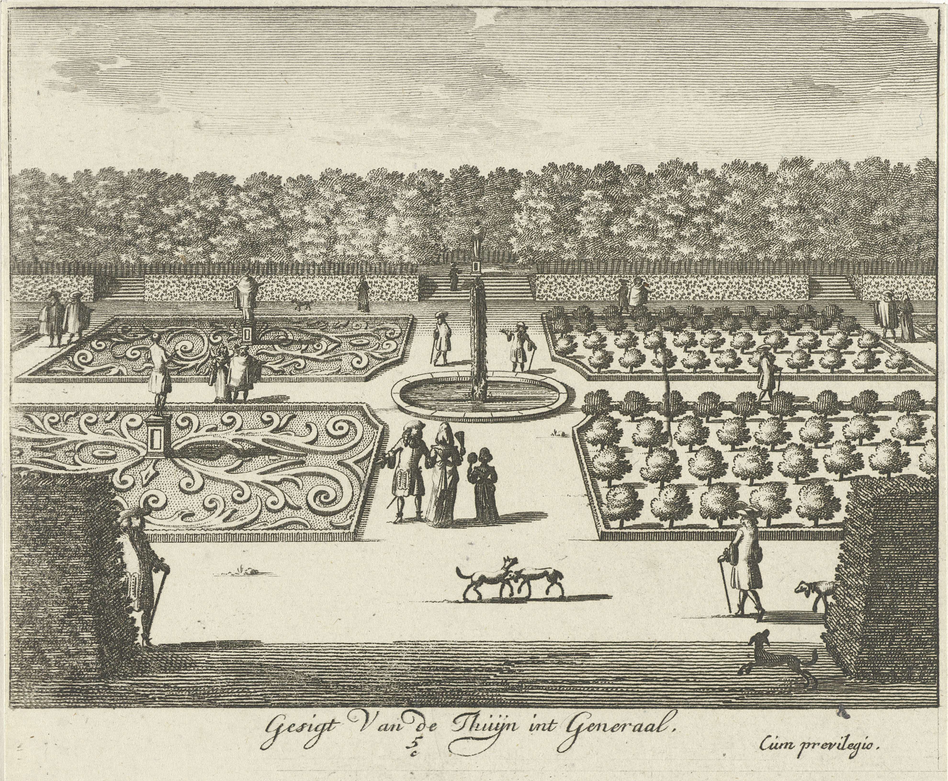 Gezicht op de aangelegde tuin van Paleis Soestdijk met wandelende figuren. De prent maakt deel uit van een serie met zestien gezichten op Paleis Soestdijk en het bijbehorende landgoed.