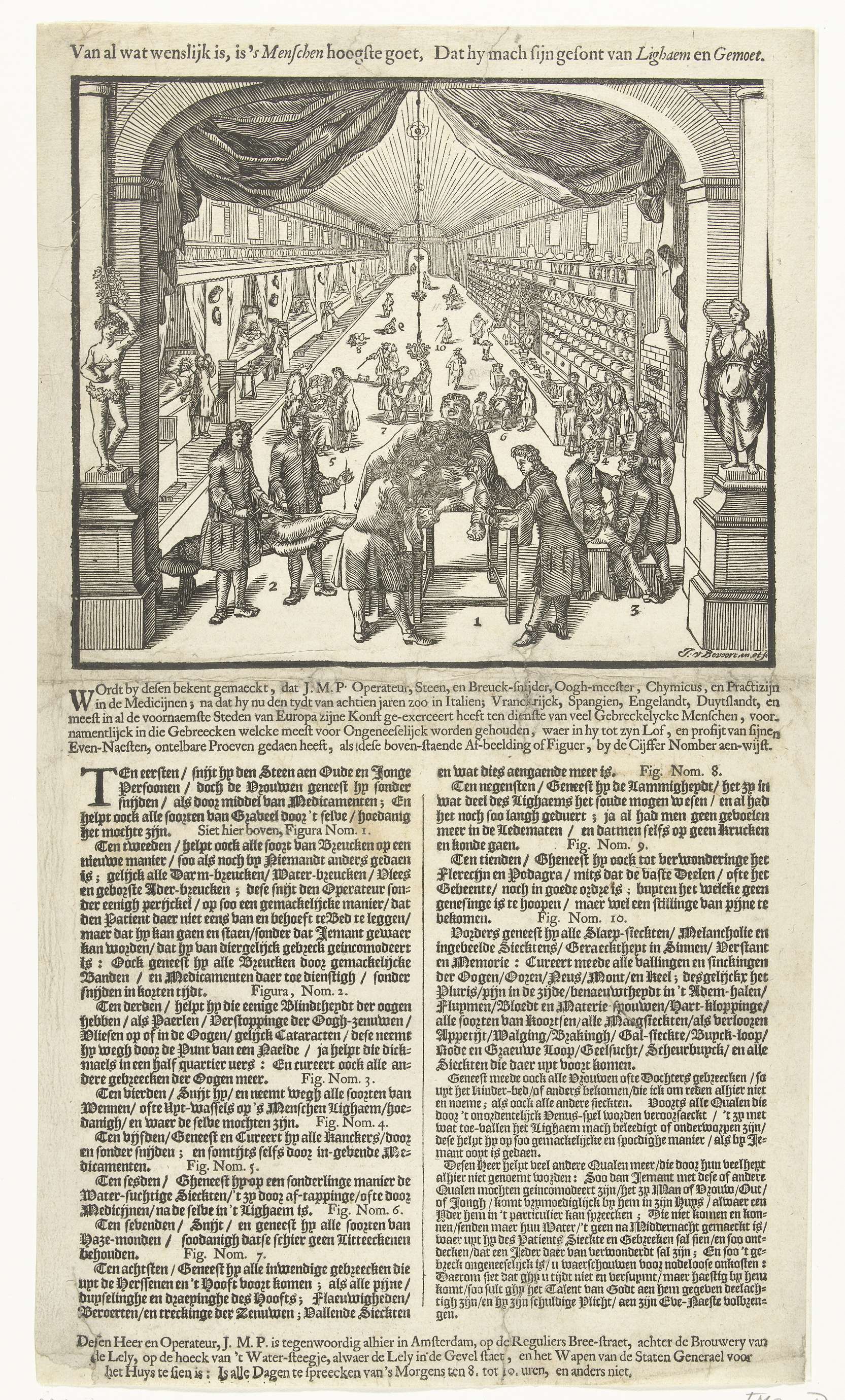 Advertentie voor de praktijk van de operateur of chirurgijn J.M.P. aan de Reguliersbreestraat te Amsterdam, ca. 1700. Op de voorgrond is een chirurg bezig met een steenoperatie bij een man. Links wordt een breuk gezet terwijl rechts een patient met een oogkwaal wordt geholpen. Op de achtergrond links een ziekenzaal en rechts de apotheek. Bij ...