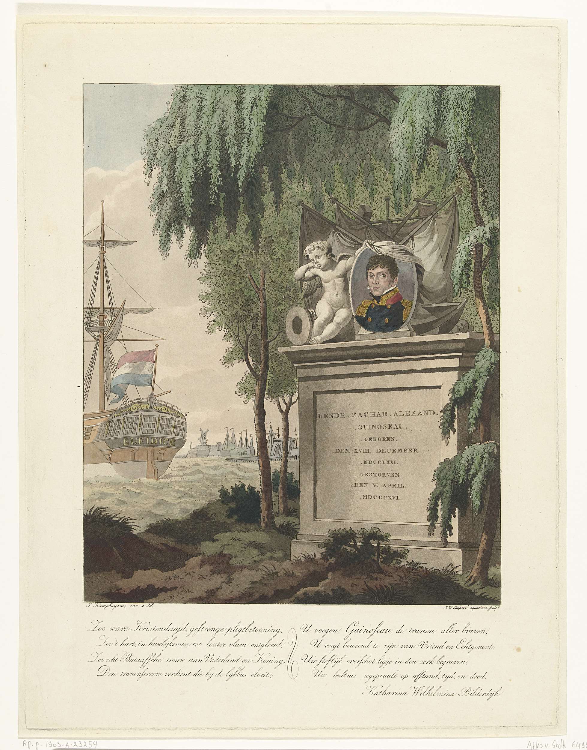 Op de voorgrond een gedenkteken met opschrift en het portret van Hendrik Zacharias Alexander Guinoseau. Het portret wordt vastgehouden door een huilend engeltje Guinoseau heeft het uniform aan van de marine, buste naar links. Een treurwilg overschaduwt het graf. Op de achtergrond de contouren van een stad en het oorlogsfregat Euridice. De prent heeft een ...
