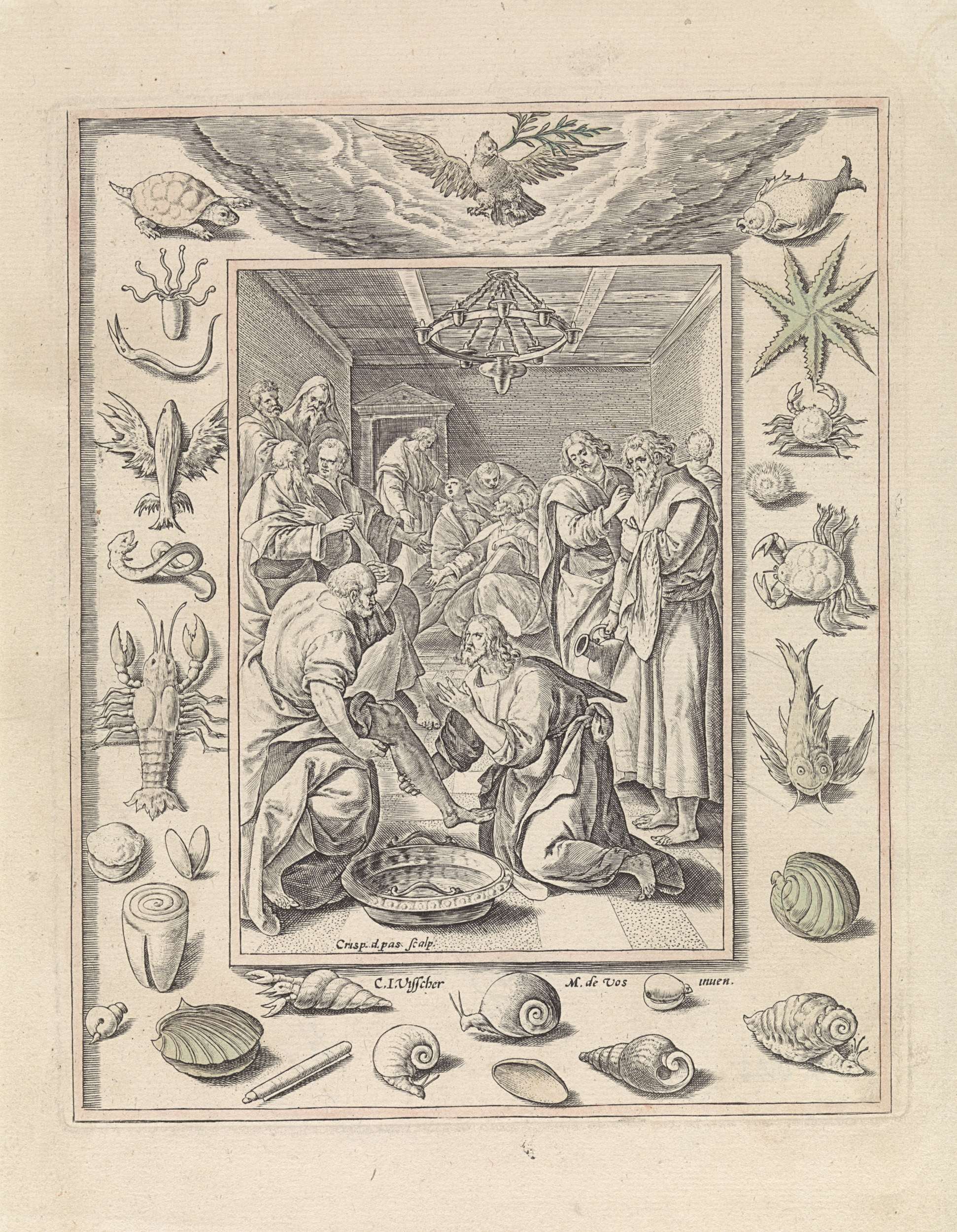 Christus wast de voeten van de apostel Petrus. De voorstelling wordt omlijst door een ornamentele rand die is versierd met schelpen en vissen, en de Heilige Geest in de vorm van een duif.