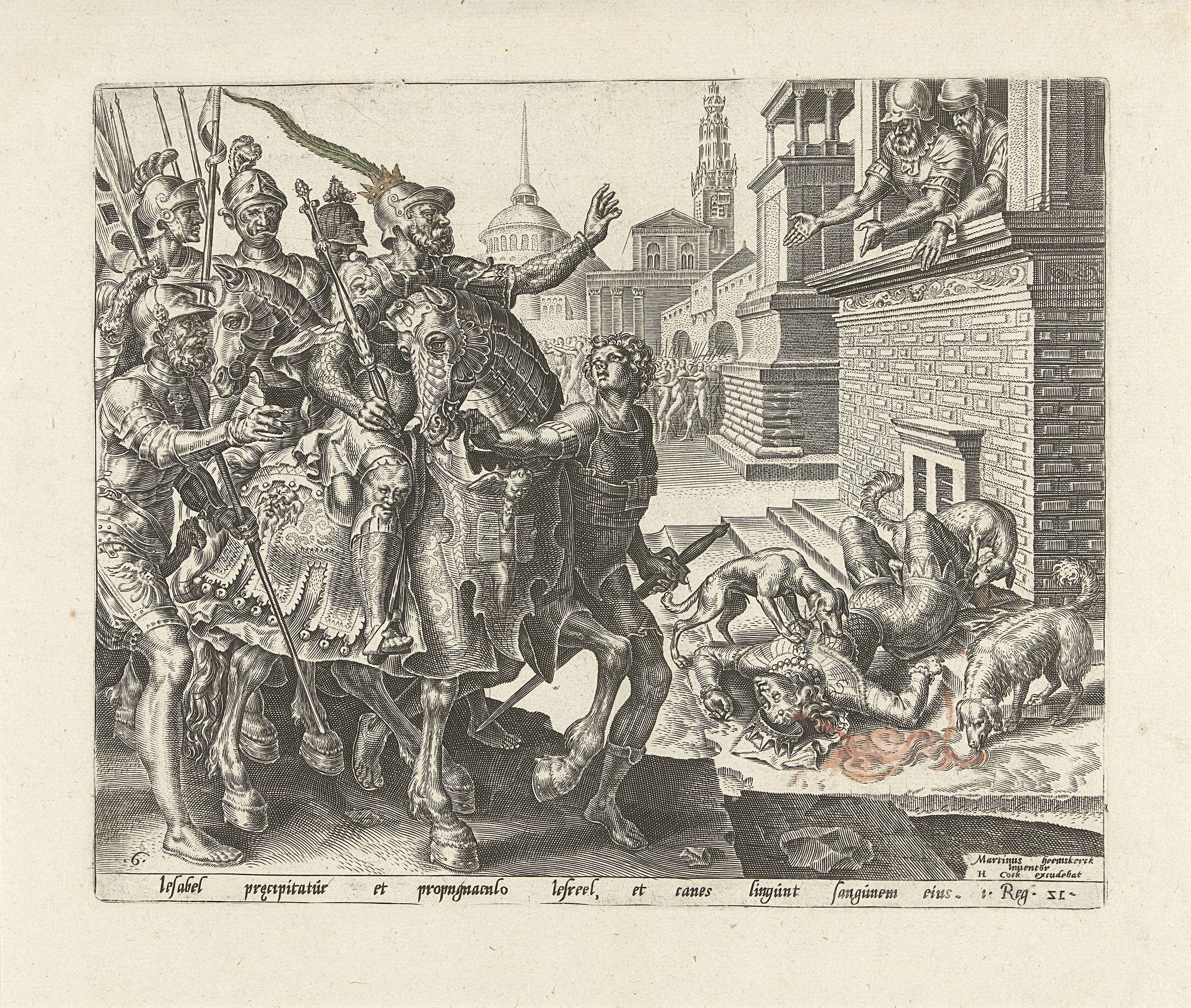 Na haar dood wordt Izebels lichaam voor de stadspoorten door de honden opgevreten. Jehu, de nieuwe koning van Israël, kijkt met zijn soldaten naar het tafereel.
