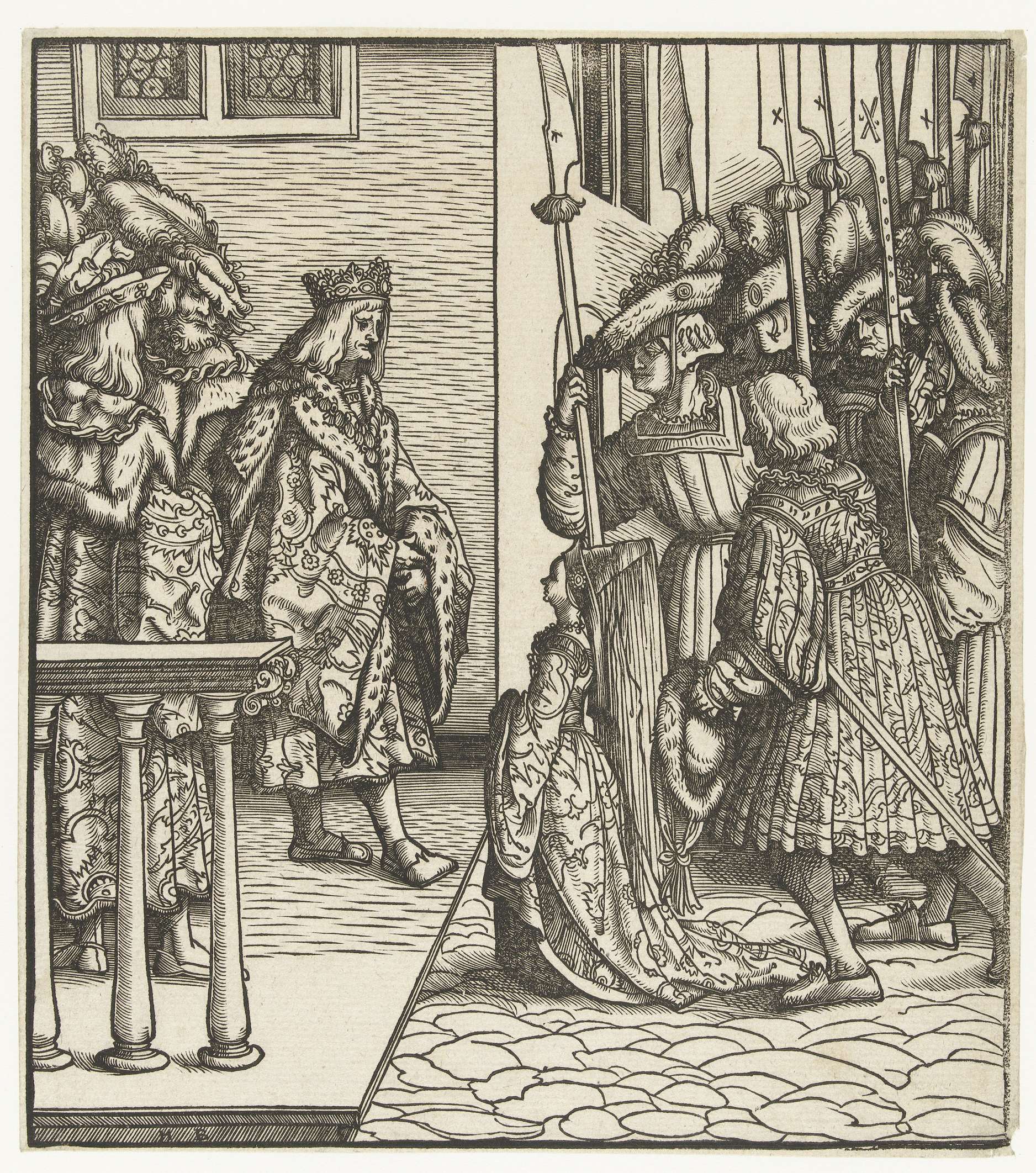 Margaretha van Oostenrijk wordt door de Fransen weer aan haar vader Maximiliaan teruggegeven. Het jonge meisje staat tussen de Fransen rechts en haar vader met mannen van zijn hof links.