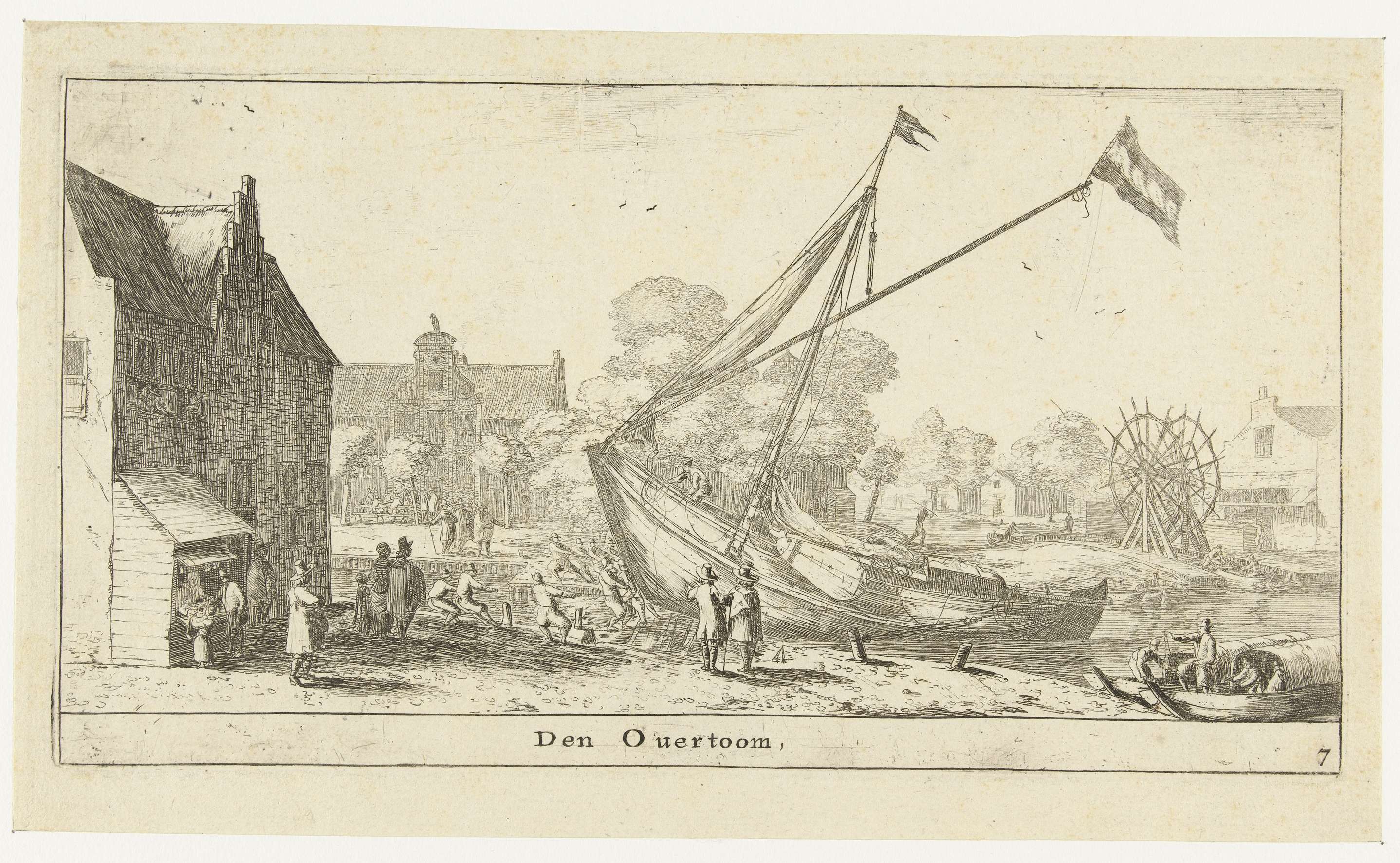 Een schip wordt over de overtoom getrokken, van de Kostverlorenvaart naar de Schinkel. Links vooraan het Leidse veerhuis, bij het begin van de Amstelveenseweg, daarachter de herberg De Valk aan de Sloterkade.