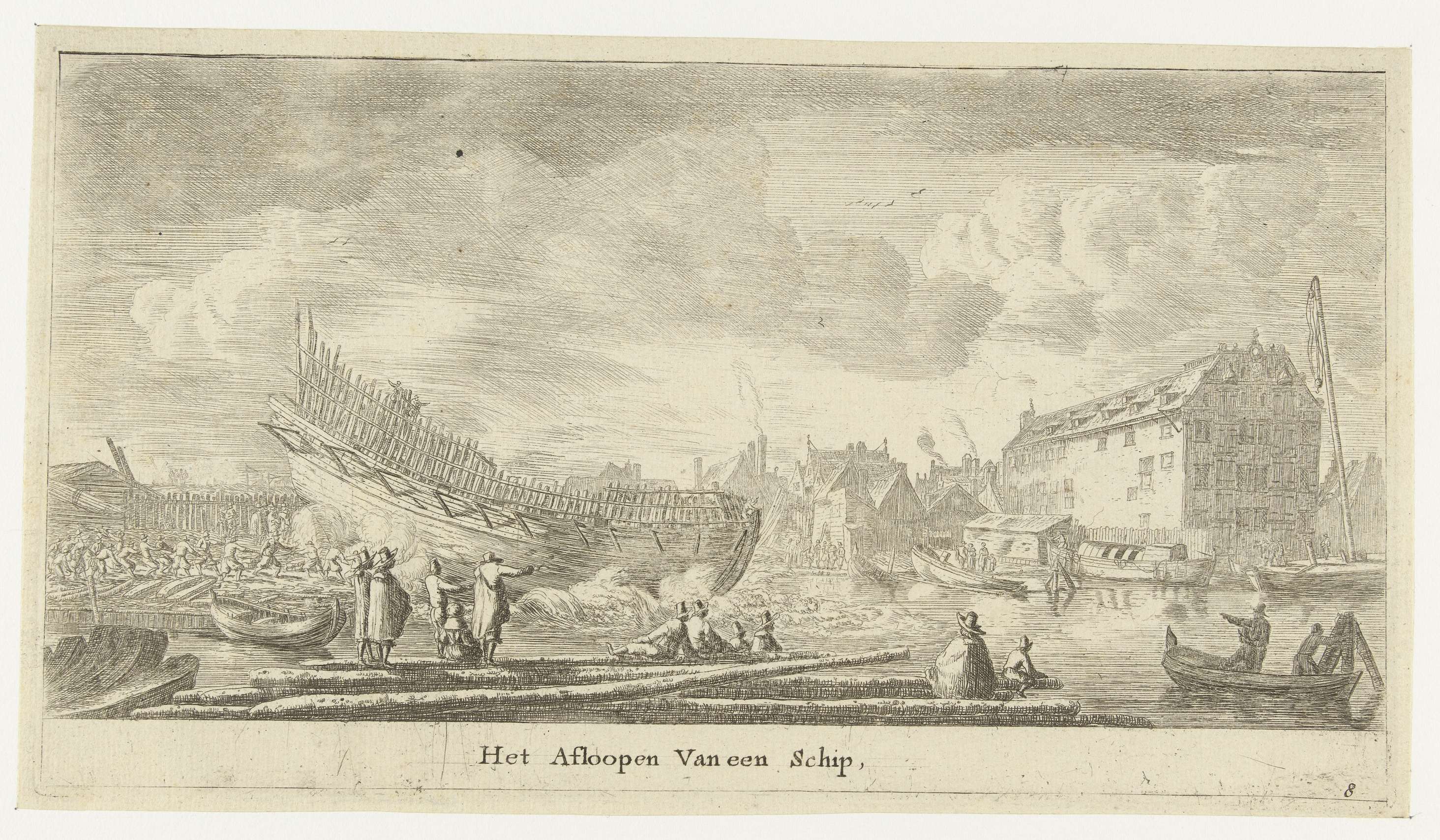 Scheepswerf van de Oostindië Compagnie (VOC) op de Rapenburg. Een tewaterlating van een groot schip waarvan de romp klaar is, maar de opbouw nog niet. Een aantal toeschouwers kijkt vanaf de kade toe.