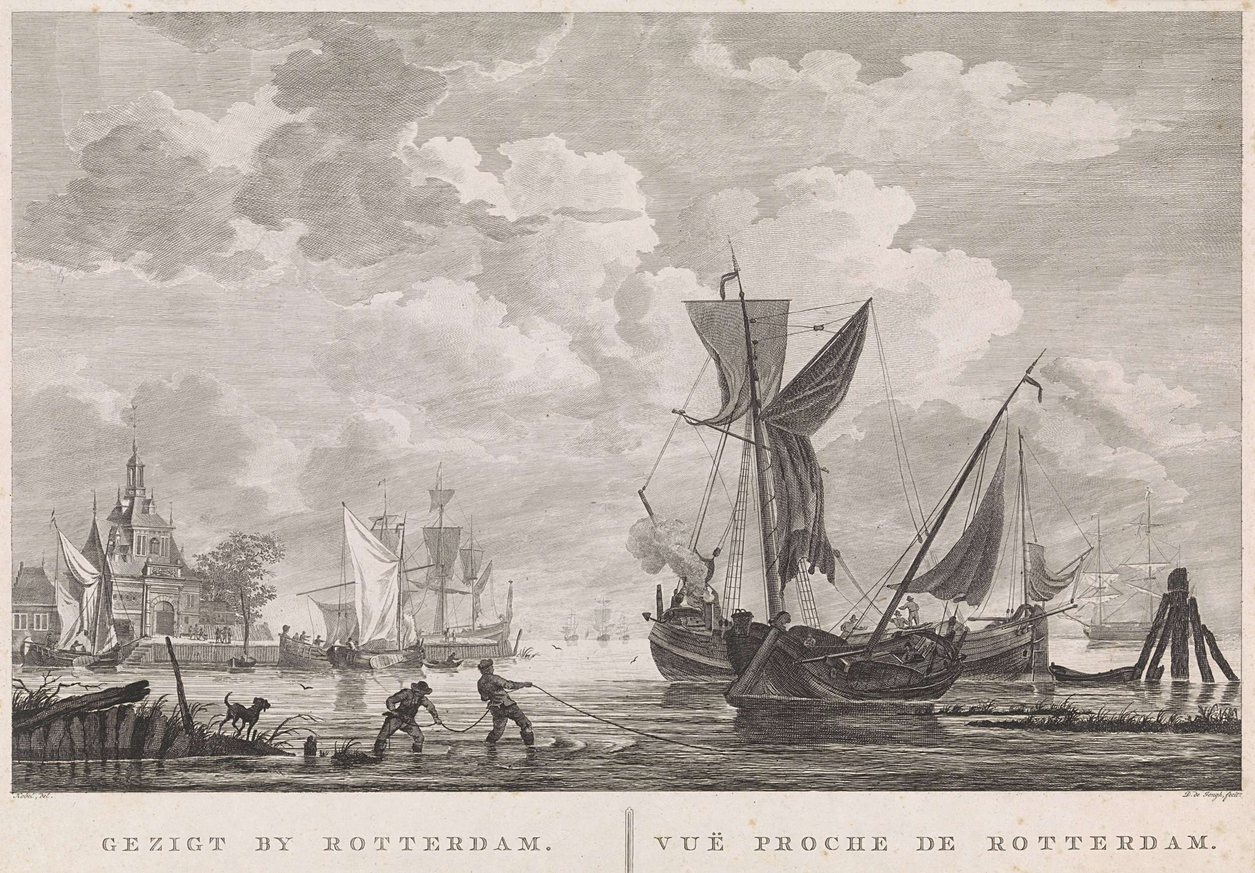 Gezicht op haven te Rotterdam met diverse schepen en links de havenpoort. Op de voorgrond twee mannen in het water en op de kade een hond. In de marge een onderschrift in het Nederlands en in het Frans.