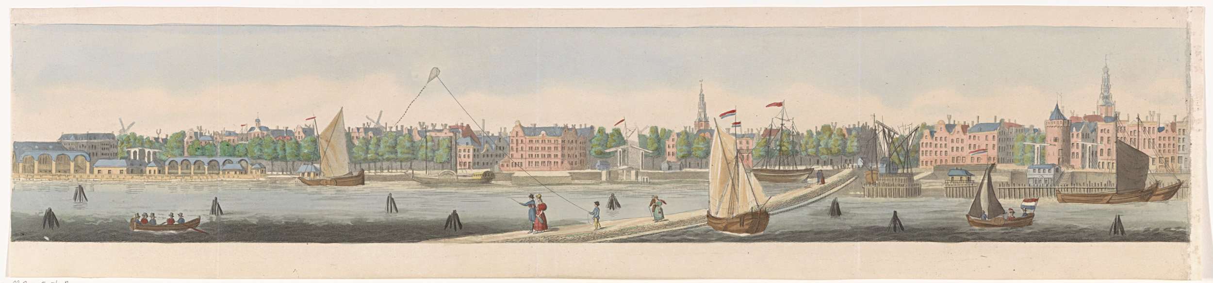 Gezicht vanaf het IJ op Amsterdam. Links 's Lands Zeemagazijn, rechts de Zuiderkerkstoren en de Schreierstoren. Op de voorgrond schepen.