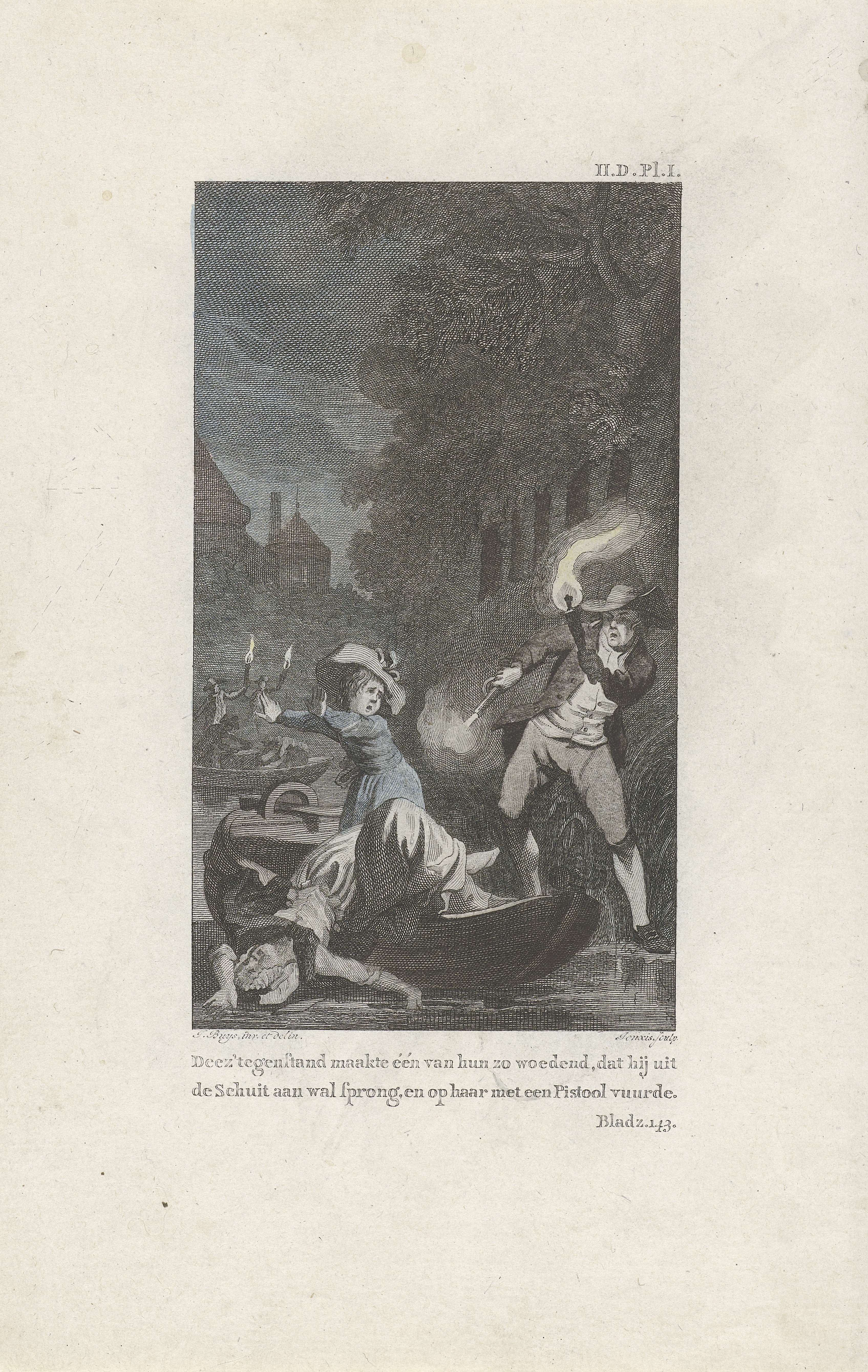Op de voorgrond een neergeschoten vrouw in een boot. Een andere vrouw probeert verschrikt te ontkomen. Op de kade staat een man met een brandende fakkel en een pistool in de handen. Op de achtergrond een tweede roeiboot met mannen met brandende fakkels.