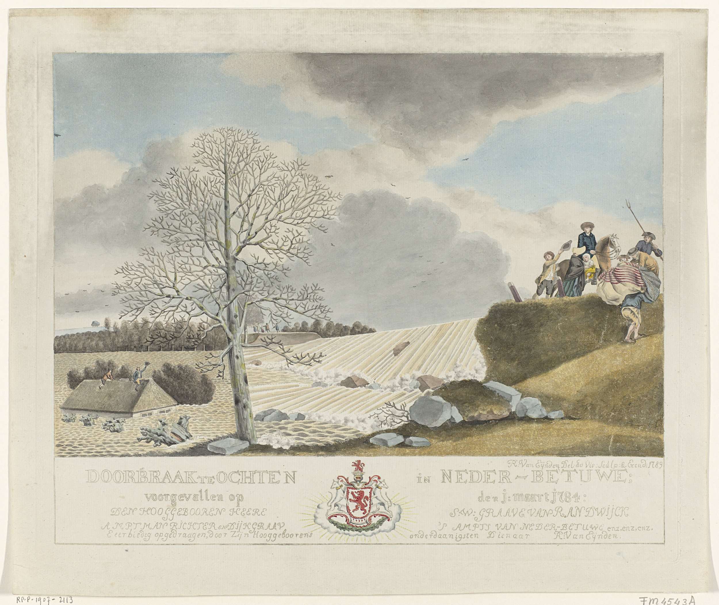 Dijkdoorbraak in Ochten in de Betuwe op 1 maart 1784: het water stroomt met grote kracht door het gat in de dijk. Een boerderij staat tot aan het dak, waarop twee mannen zitten, onder water. Rechts redden enkele mensen huisraad en dieren. In het onderschrift de titel, opdracht en een wapen.