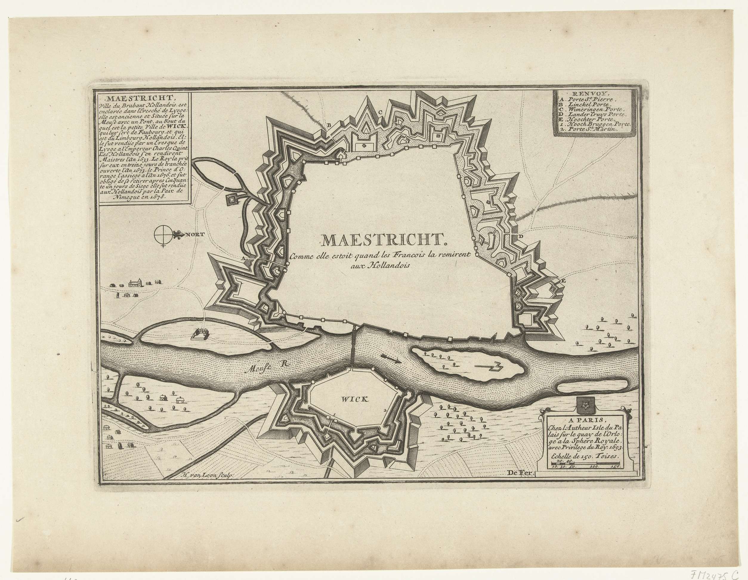Plattegrond van de versterkingen rondom Maastricht, belegerd en veroverd door het Franse leger, 27-30 juni 1673. Linksboven een cartouche met een overzichtje van de historie van de stad vanaf 1633 tot 1678. Rechtsboven de legenda A-E en 1-2 in het Frans.