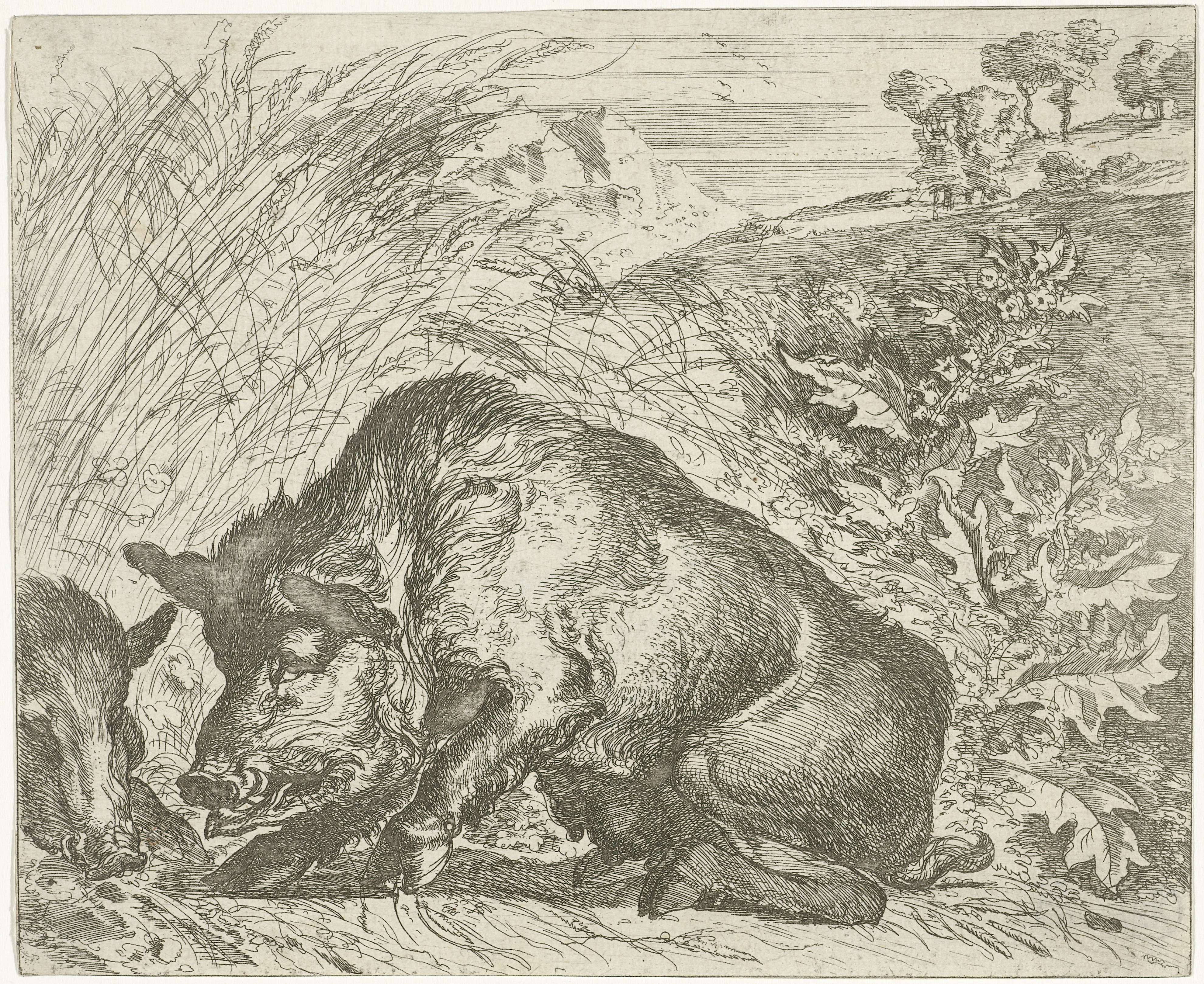 Een wild zijn in een landschap. Prent uit een serie prenten met jagende dieren.