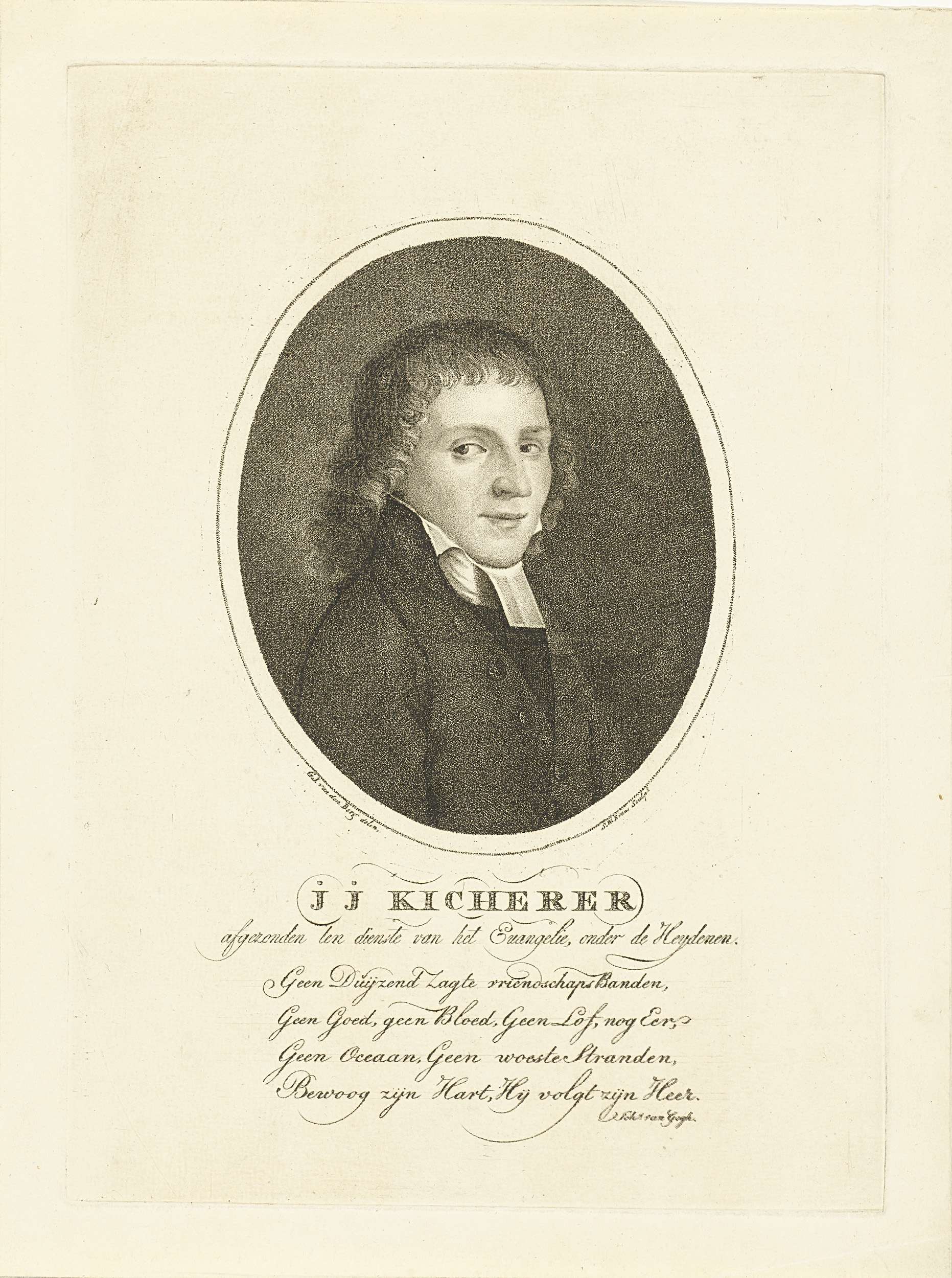 Ovaal busteportret van Johannes Jacobus Kicherer, predikant en missionaris. Onder de voorstelling zijn naam en een Nederlands vers van vier regels.