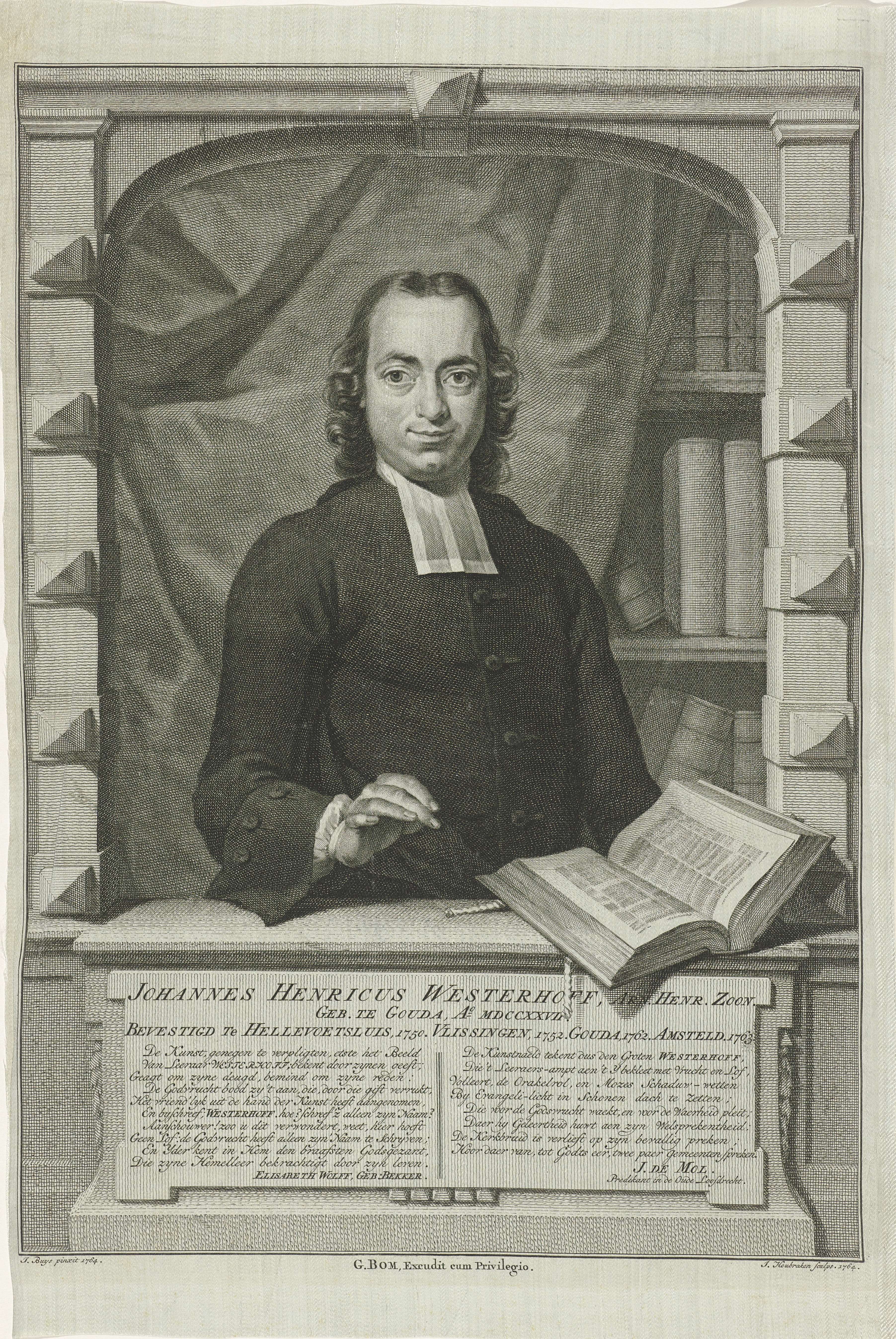 Portret ten halven lijve van Johannes Henricus Westerhoff, in een architectonische venstervormige omlijsting, met voor hem een opengeslagen bijbel. Onder de vensterbank een plaquette met daarop de naam en gegevens van de geportretteerde in drie regels in het Nederlands en daaronder twee naast elkaar geplaatste verzen: links een tienregelig vers in het Nederlands en rechts ...