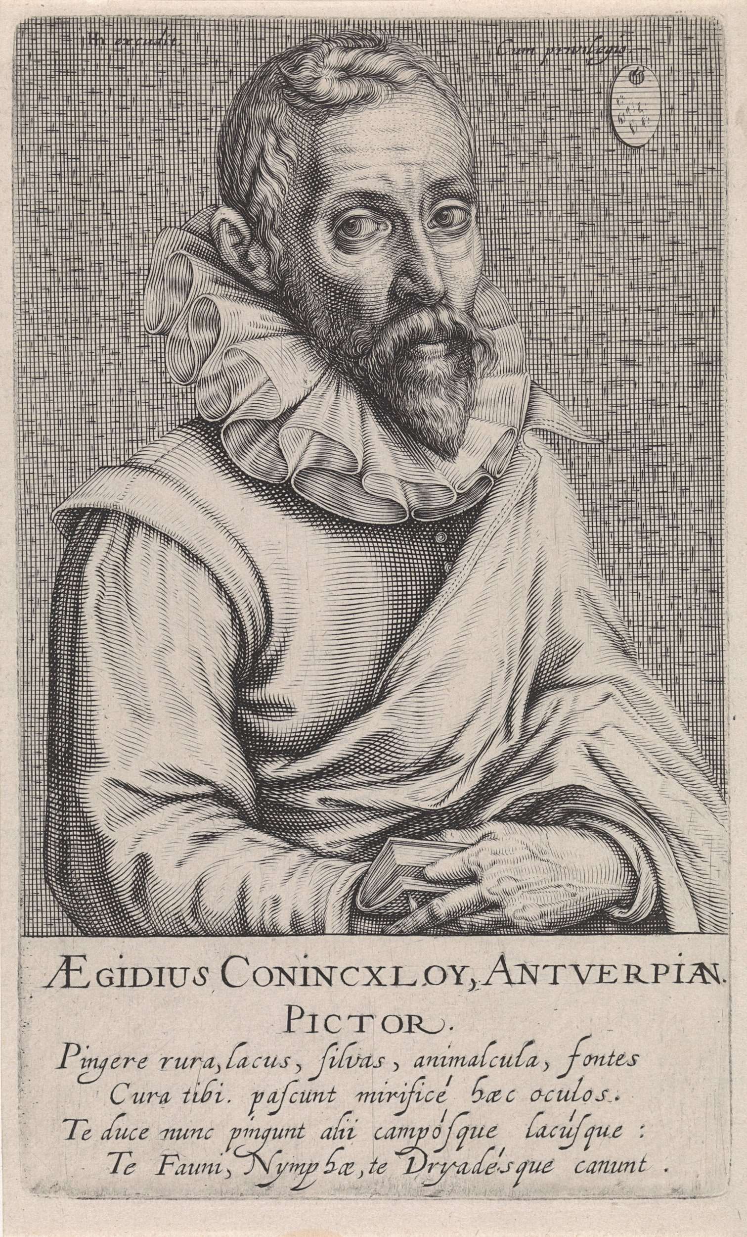 Portret ten halven lijve naar rechts van Gillis van Coninxloo. Onder het portret zijn naam en vier regels in het Latijn. Prent uit deel 2 van de serie Pictorum Aliquot Celebrium Praecipuae Germaniae Inferioris Effigies. Serie van 72 kunstenaarsportretten vervaardigd door Hendrick Hondius I, Simon Frisius, Andries Jacobsz. Stock en Robert de Baudous.