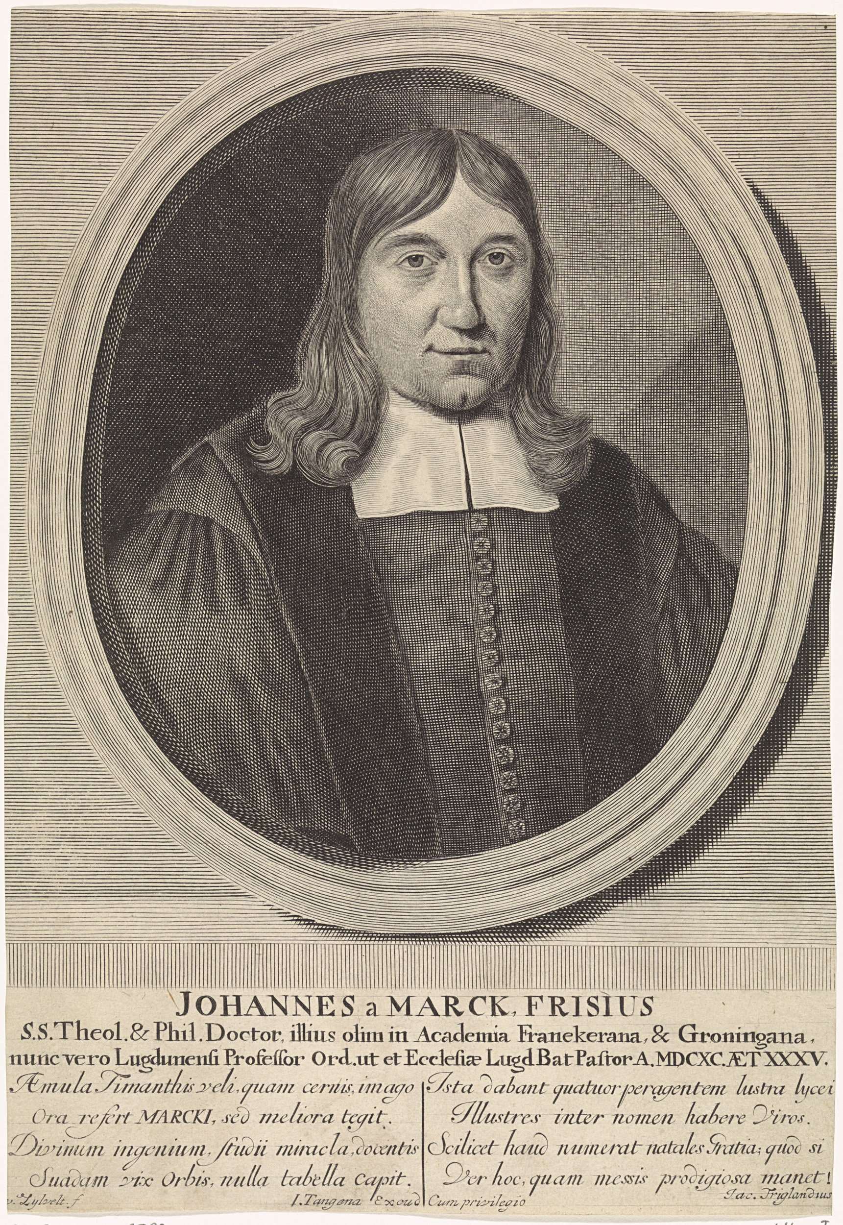 Predikant en hoogleraar in de theologie Johannes à Marck, gekleed in toga met witte bef. Onder het portret twee vierregelige verzen in het Latijn.