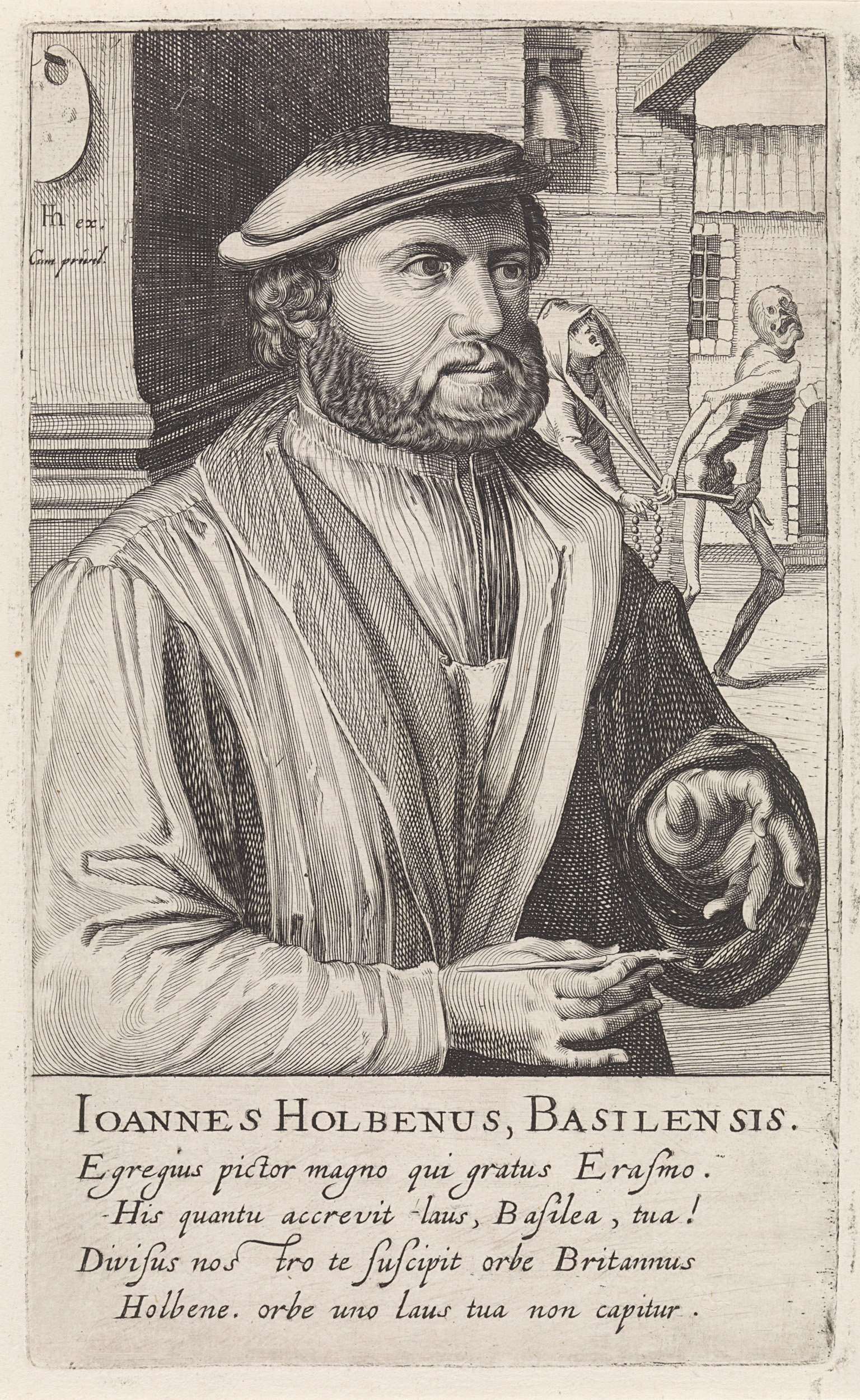 Portret ten halven lijve naar rechts van Hans Holbein. Onder het portret zijn naam en vier regels in het Latijn. Prent uit deel 2 van de serie Pictorum Aliquot Celebrium Praecipuae Germaniae Inferioris Effigies. Serie van 72 kunstenaarsportretten vervaardigd door Hendrick Hondius I, Simon Frisius, Andries Jacobsz. Stock en Robert de Baudous.