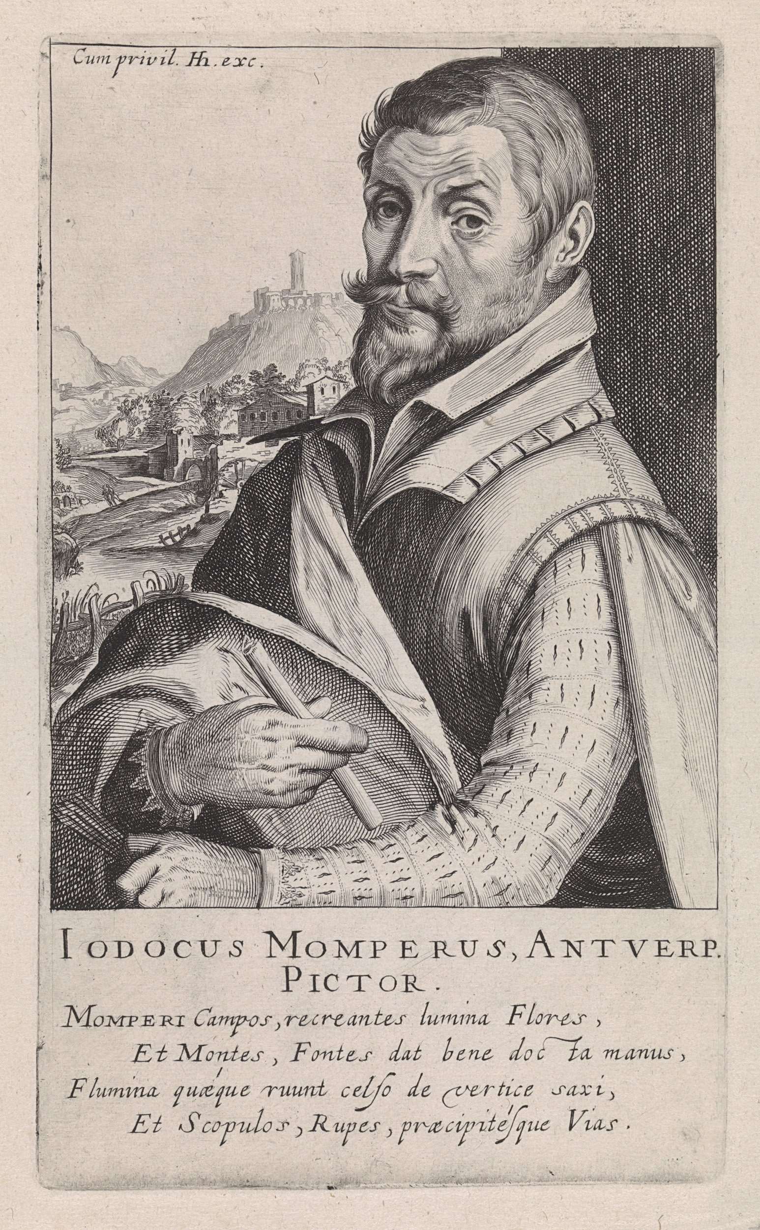 Portret ten halven lijve naar links van Joos de Momper. Onder het portret zijn naam en vier regels in het Latijn. Prent uit deel 2 van de serie Pictorum Aliquot Celebrium Praecipuae Germaniae Inferioris Effigies. Serie van 72 kunstenaarsportretten vervaardigd door Hendrick Hondius I, Simon Frisius, Andries Jacobsz. Stock en Robert de Baudous.