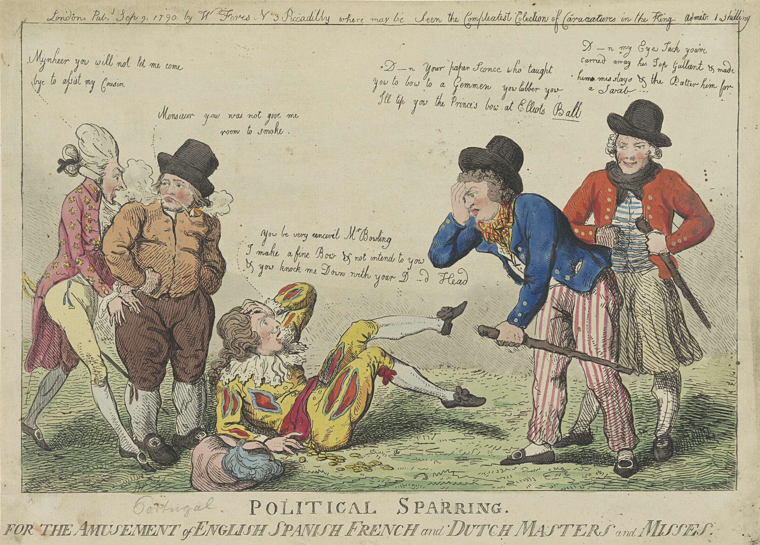 Spotprent op de crisis tussen de Britten en de Spanjaarden in de Nootka Sound bij Vancouver Island in de zomer van 1789. De Spanjaard ligt op de grond na met zijn hoofd te zijn gebotst met de Engelse matroos. Een tweede Engelse matroos kijkt spottend toe. De Fransman links probeert zijn Spaanse bondgenoot te hulp ...
