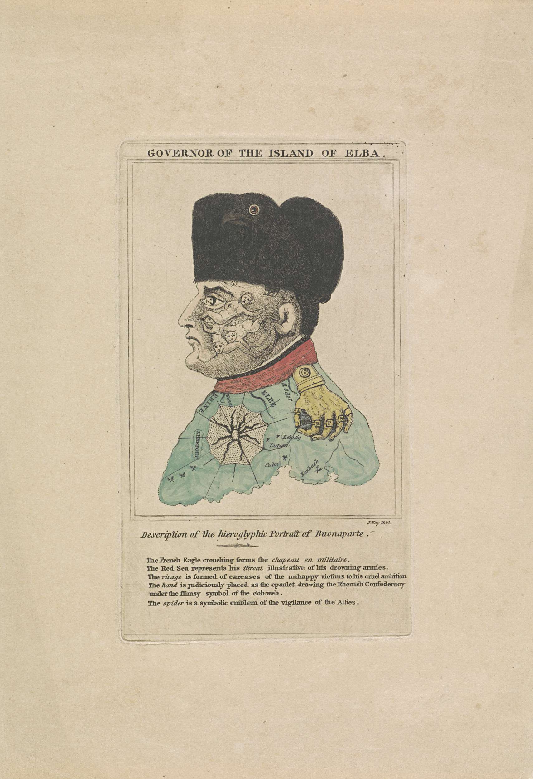 Spotprent op Napoleon van 1814 waarbij zijn gezicht is opgebouwd uit de lijken van zijn slachtoffers, zijn hoed is de Pruisische adelaar, zijn epaulet is een grijpende hand waarvan de vingers ringen dragen met de letters A, R, P en S. De kraag is een rivier van bloed, zijn jas het slagveld van Europa en ...
