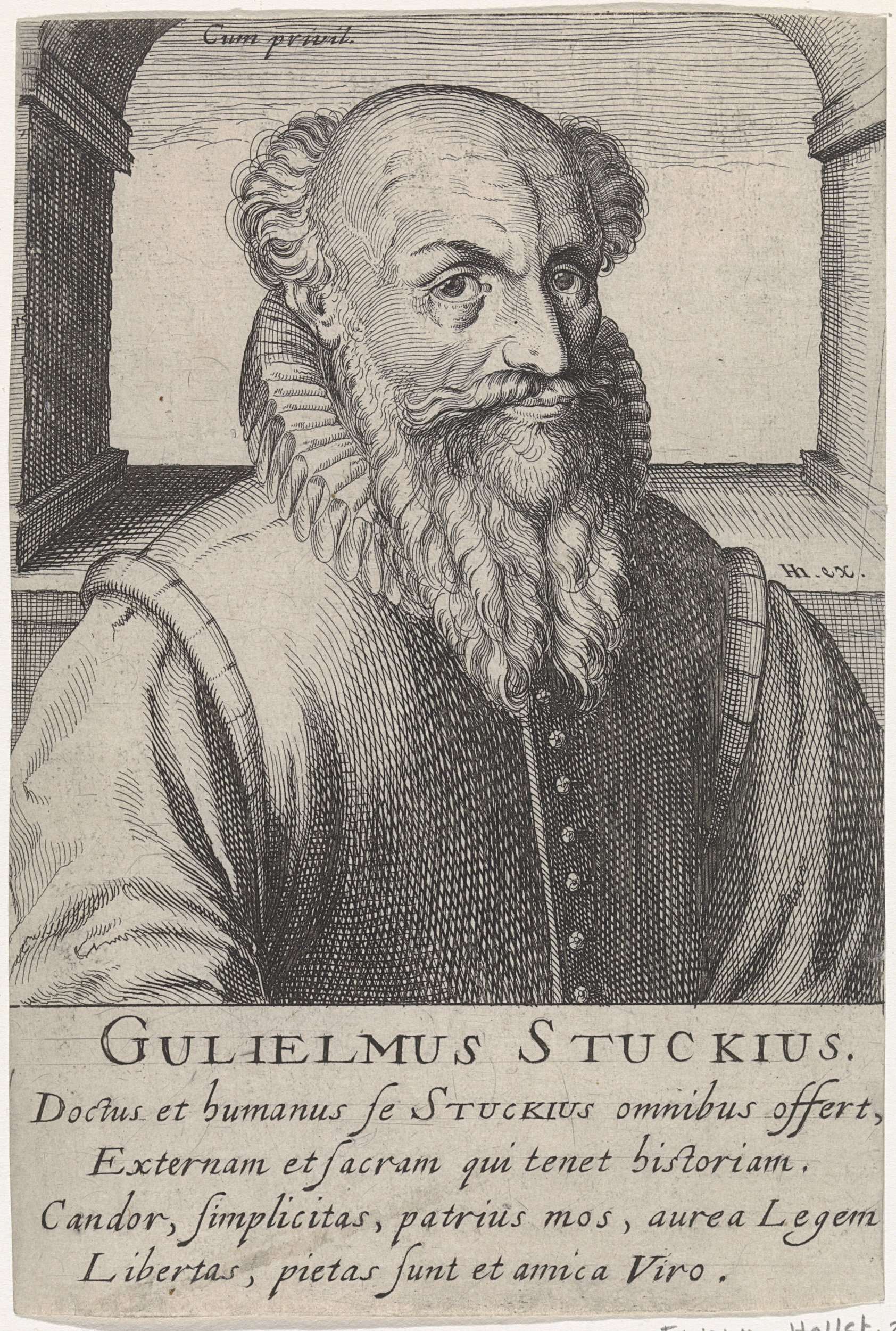 Buste naar rechts van Johann Wilhelm Stuck. Onder het portret zijn naam en vier regels in het Latijn. Prent uit het later toegevoegde deel 2 (28 prenten) van de serie portretten van beroemde hervormers door Hendrick Hondius uit 1599.