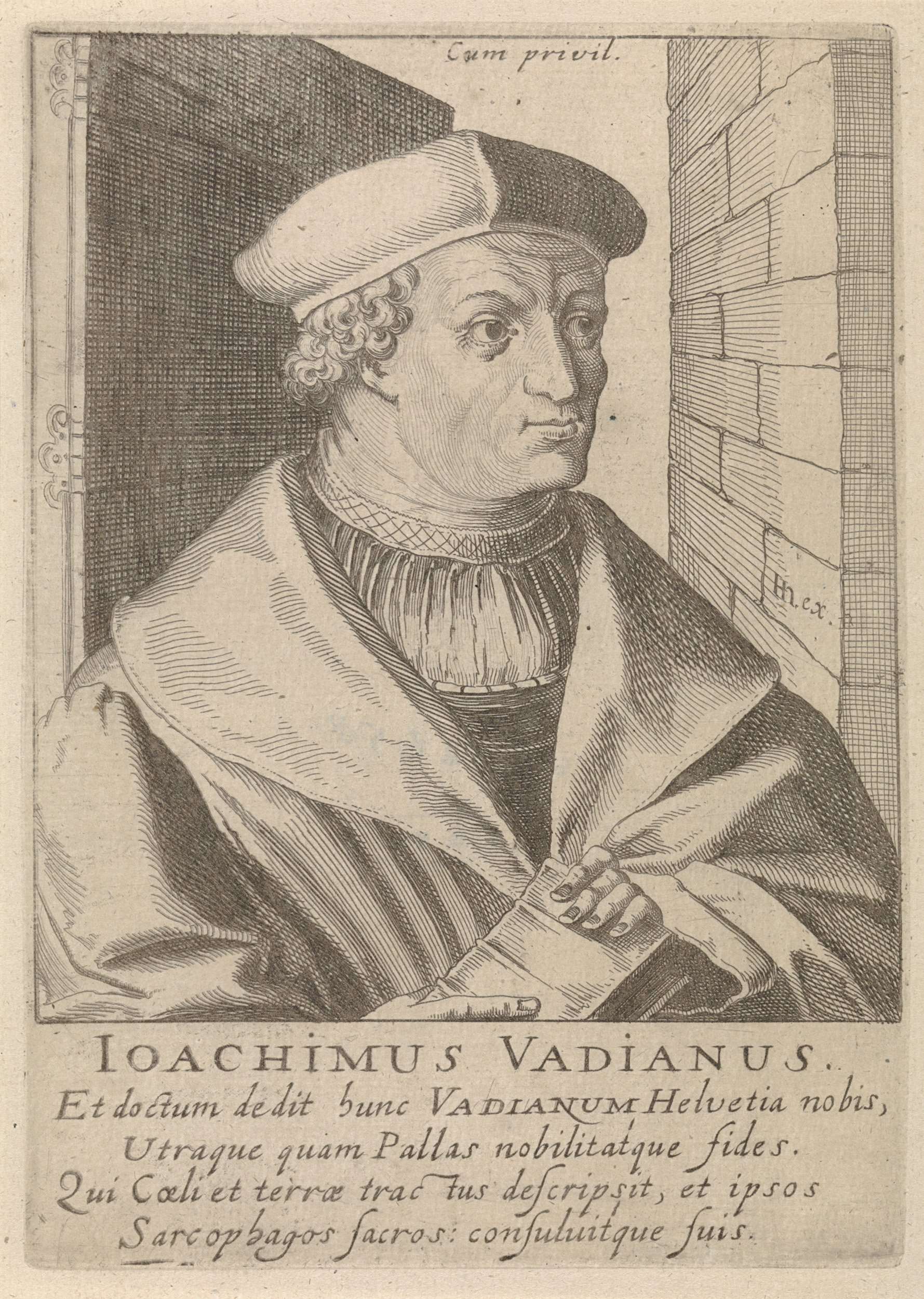 Buste naar rechts van Joachim de Watt. Onder het portret zijn naam en vier regels in het Latijn. Prent uit het later toegevoegde deel 2 (28 prenten) van de serie portretten van beroemde hervormers door Hendrick Hondius uit 1599.