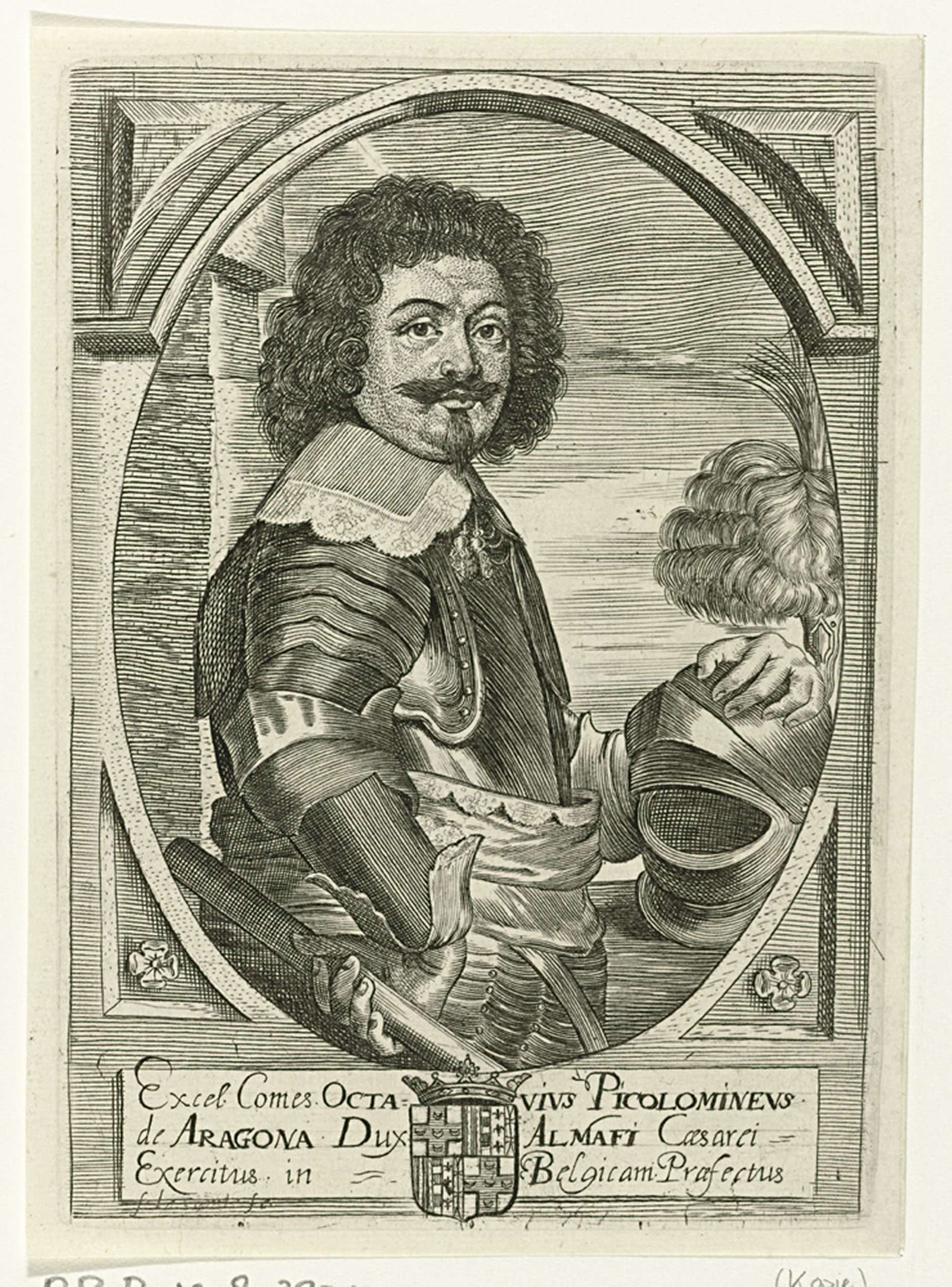 Portret van Ottavio Picolomini, ten halven lijve. Zijn linkerhand rust op zijn helm en in zijn rechterhand houdt hij een commandostaf. Het portret is gevat in een ovale omlijsting met vierkant randwerk met rozetten. In het kader het wapenschild van de geportretteerde en een drieregelig onderschrift in het Latijn. Kopie naar de gelijknamige prent van ...