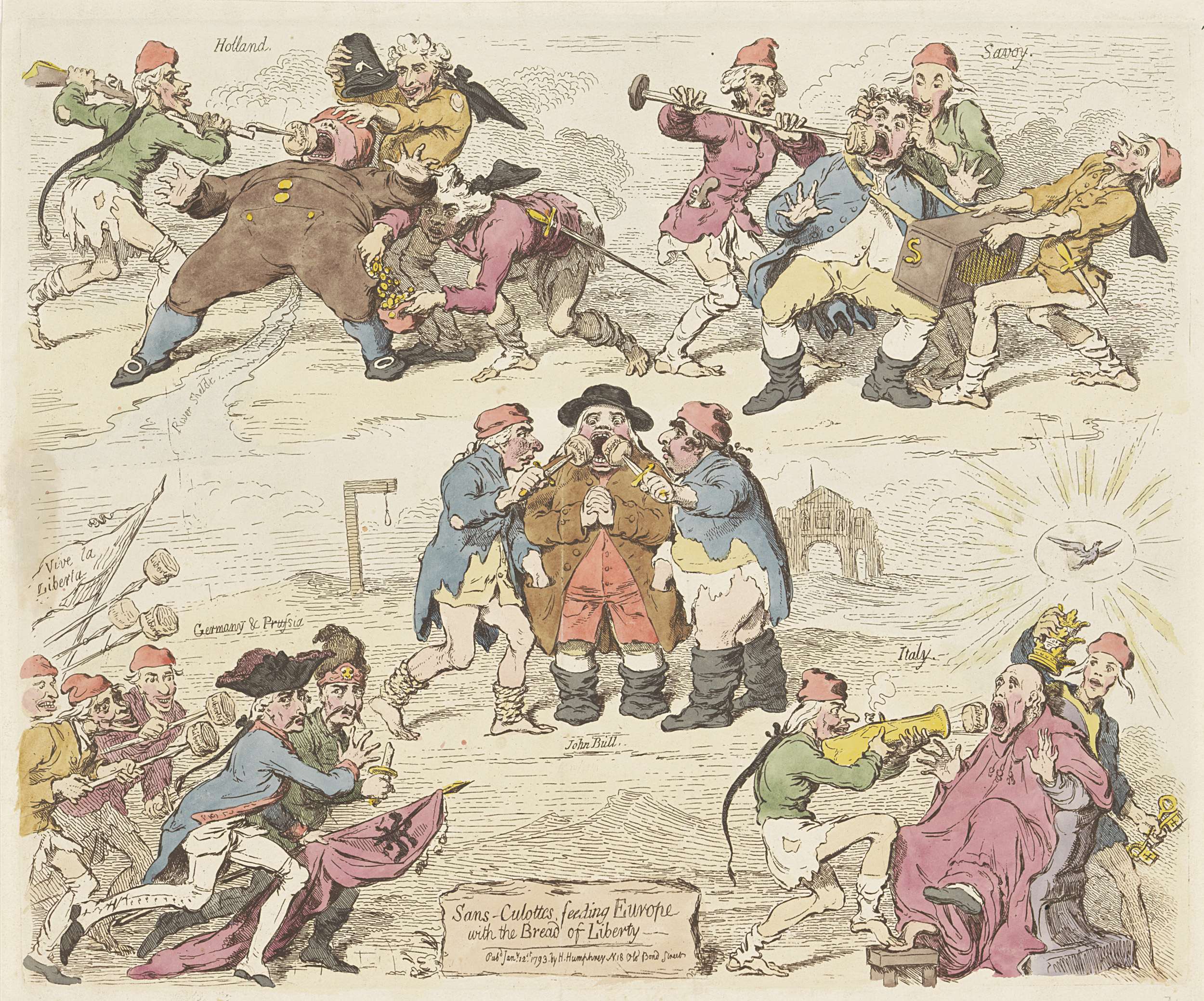 Spotprent waarin de Franse sansculotten in vijf aparte scènes de verschillende Europese landen het Franse brood van de vrijheid laten eten, 1793. John Bull (Engeland) wordt, in het midden, door twee sansculotten gevoerd met hompen brood. Eromheen gebeurt hetzelfde met Nederland, Savoie, Duitsland en Italië. Linksboven krijgt de Nederlander aan een bajonet het brood door ...
