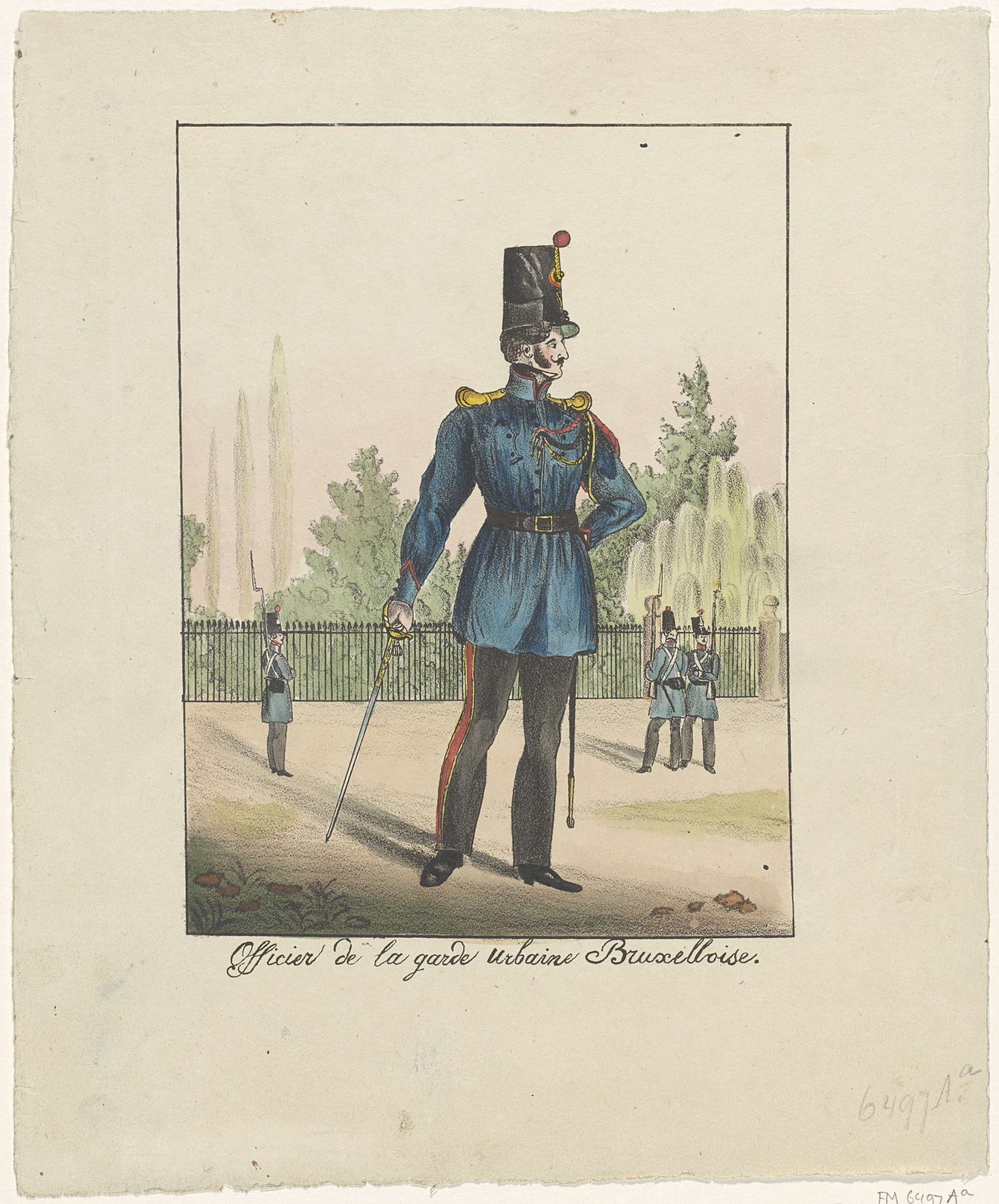 Een officier van de vrijwillige stadswacht van Brussel, de Garde Urbaine, in de karakteristieke blauwe werkmanskiel, 1830. Onderdeel van een groep voorstellingen van Belgische uniformen.