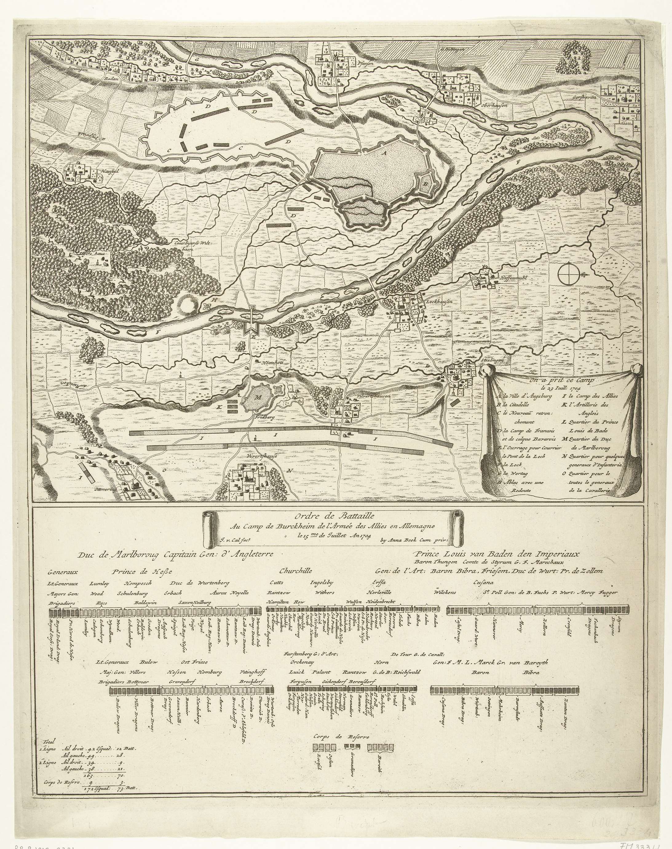 Plan van het legerkamp en de slagorde van de Geallieerden bij Augsburg, 1704