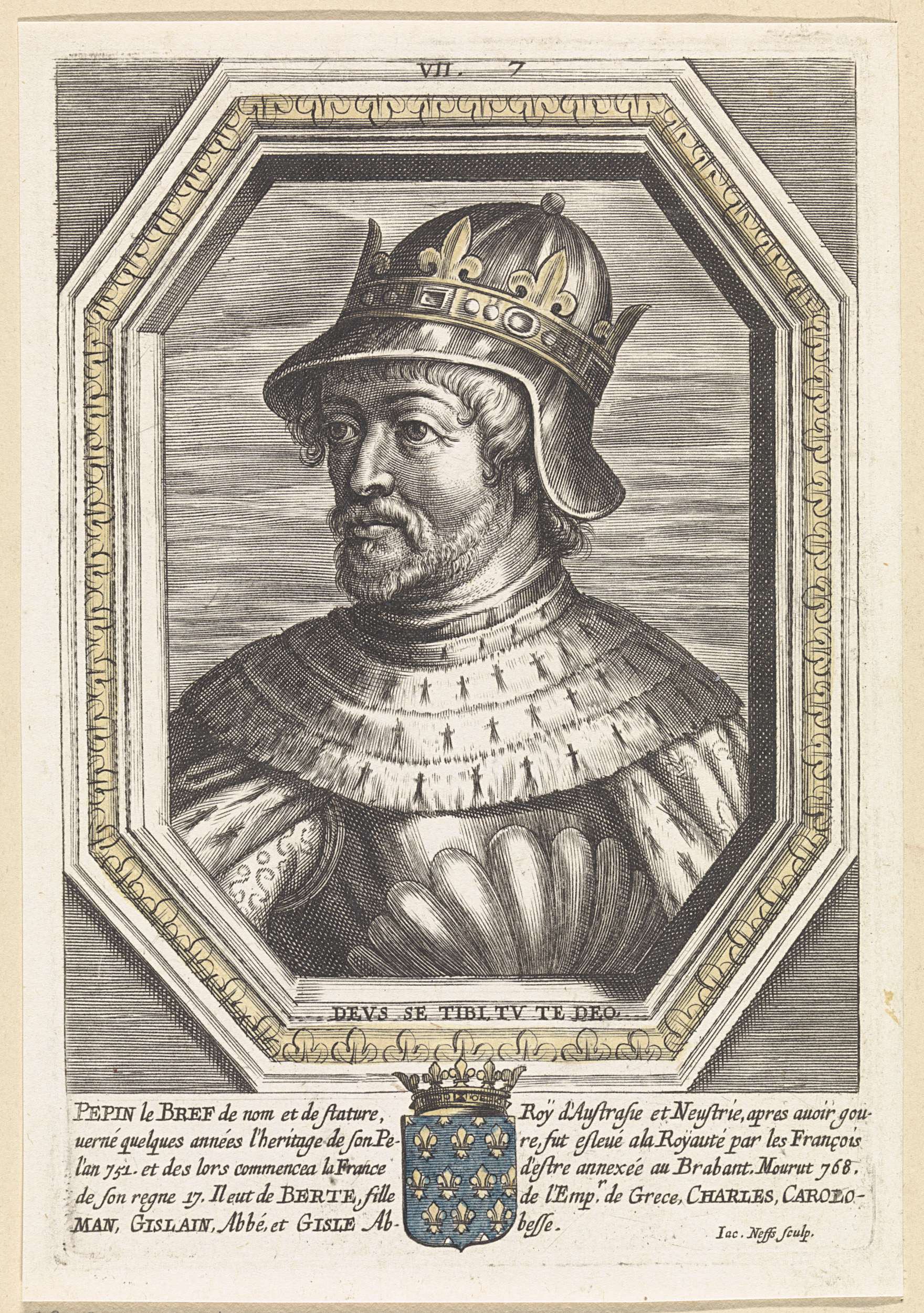 Pepijn de Korte, koning van de Franken, gekleed in harnas en met een gekroonde helm op het hoofd. Buste naar links in een achthoekige lijst. Onderaan in de marge zijn wapen en twee kolommen van vijf regels in het Frans. Midden boven op de lijst genummerd: VII. 7.