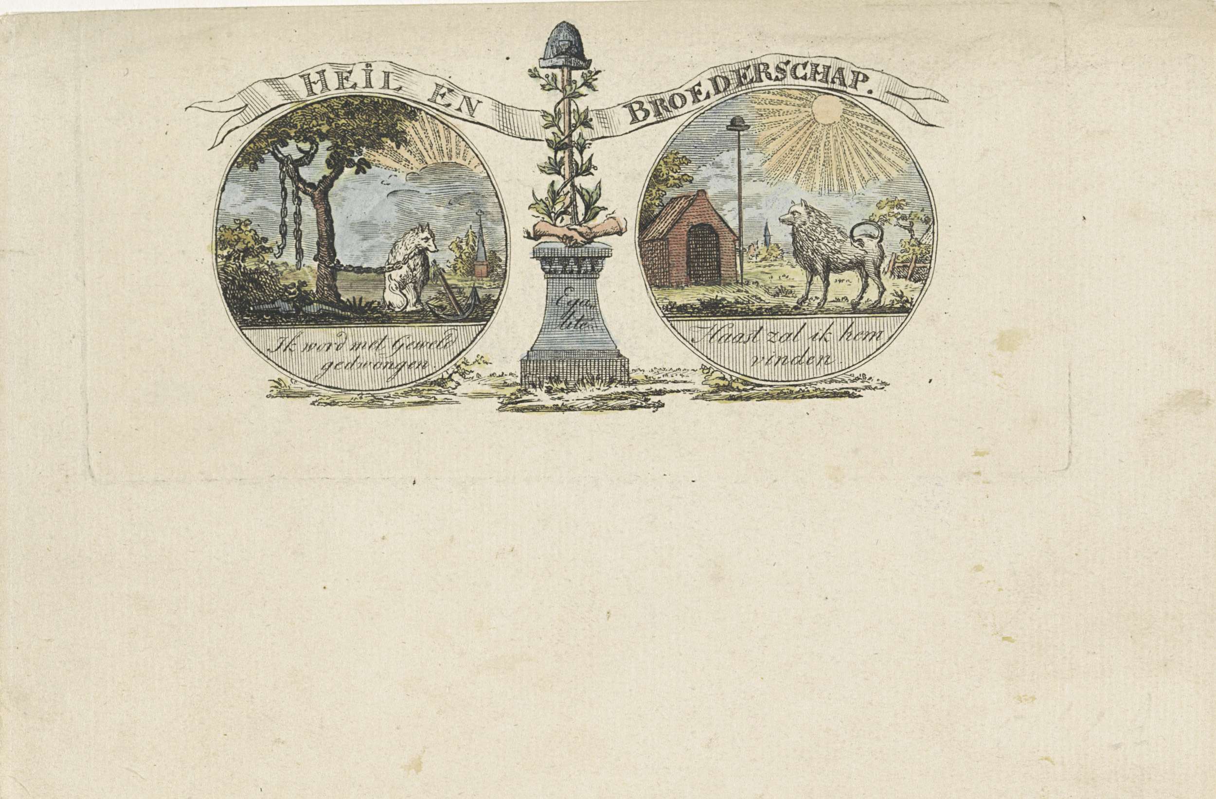 Allegorie op de afwachtende houding van de Patriotten of Kezen na 1787, ca. 1791-1792. In cirkel links: een keeshond met ketting aan een boom geklonken. Met onderschrift: ik word met geweld gedwongen. In cirkel rechts: een keeshond staand voor een hondenhok en paal met vrijheidshoed. Met onderschrirft: Haast zal ik hem vinden. Tussen de beide ...