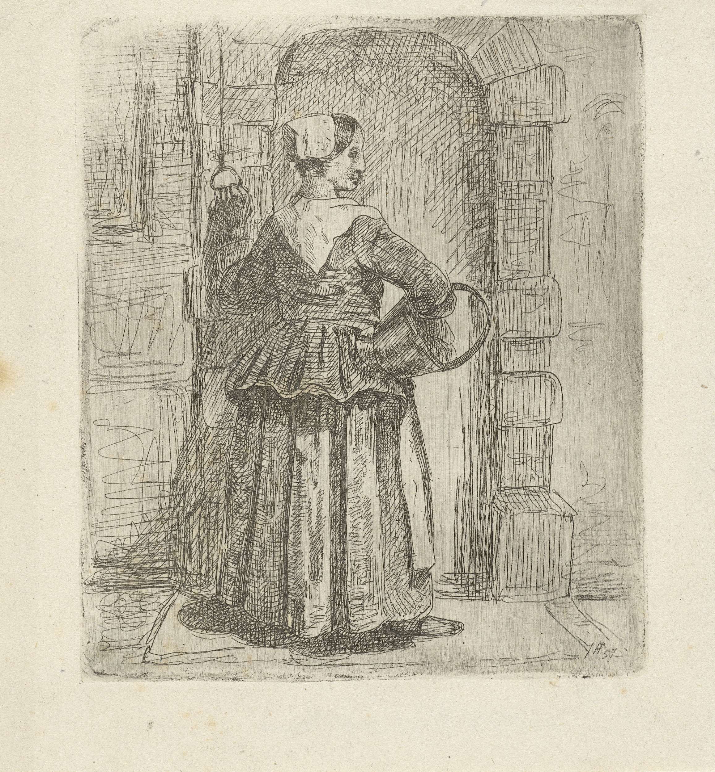Een vrouw op de rug gezien met aan haar rechterarm een mand, trekt aan een bel voor een poort.