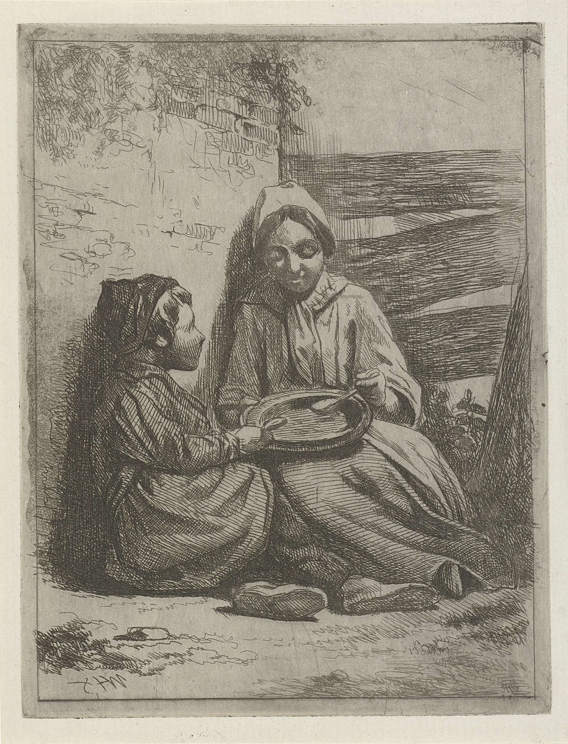 Een meisje en een jongen zittend op de grond bij een muur en hek eten met lepels uit een bord.