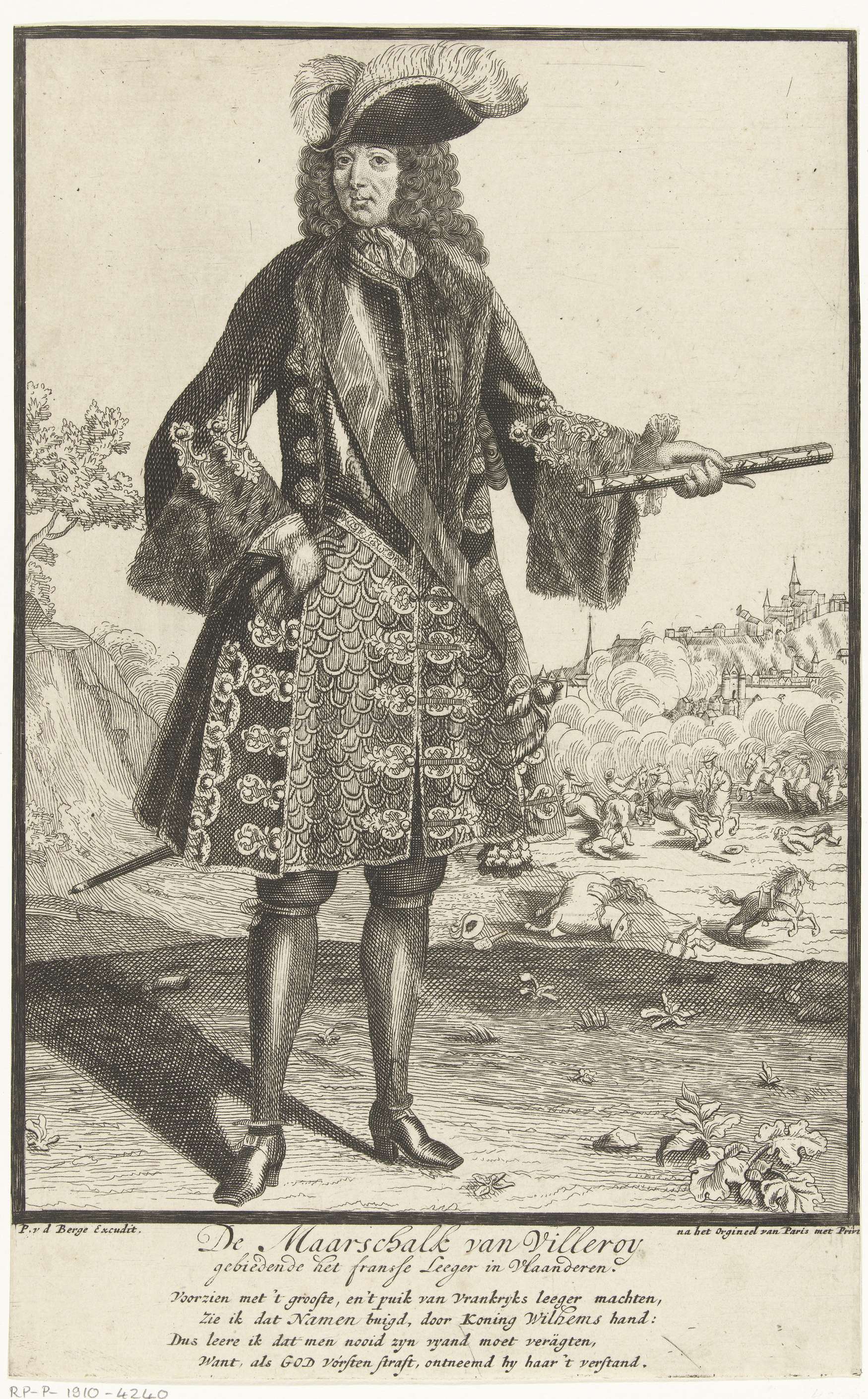 Portret van maarschalk François de Neufville, hertog van Villeroy bevelhebber over het Franse leger in Vlaanderen ten voeten uit met komandostaf in zijn hand. Op de achtergrond is de belegering van een stad te zien. Onder het portret een spotvers op de maarschalk van vier regels in het Nederlands.