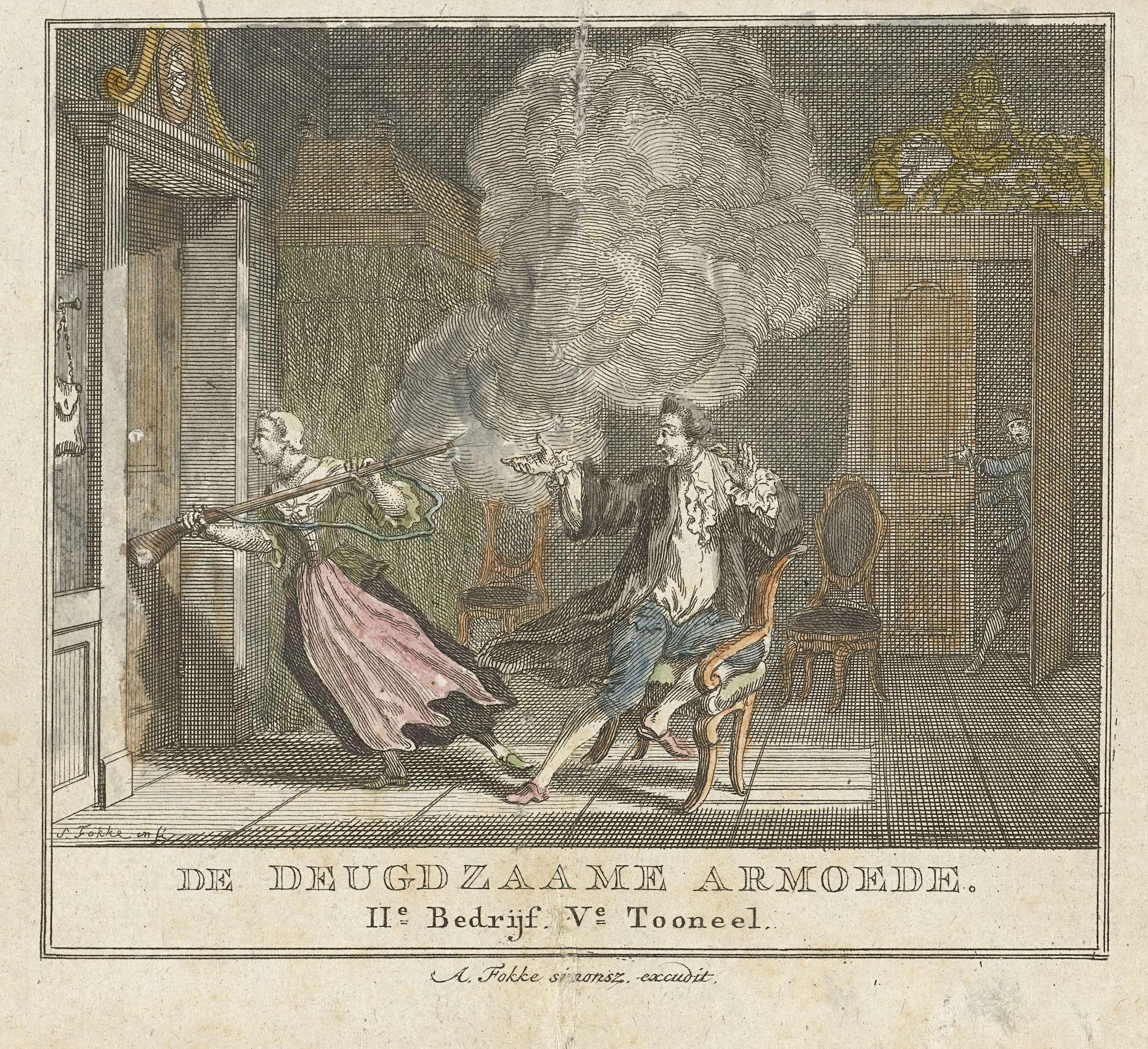 In een vertrek probeert een vrouw de deur met de kolf van een geweer open te krijgen. Op een stoel achter haar zit een man die verschrikt wijst op de loop van het geweer waaruit rook komt. Deze prent is vervaardigd voor het blijspel "De deugdzaame armoede" van Louis-Sébastien Mercier.