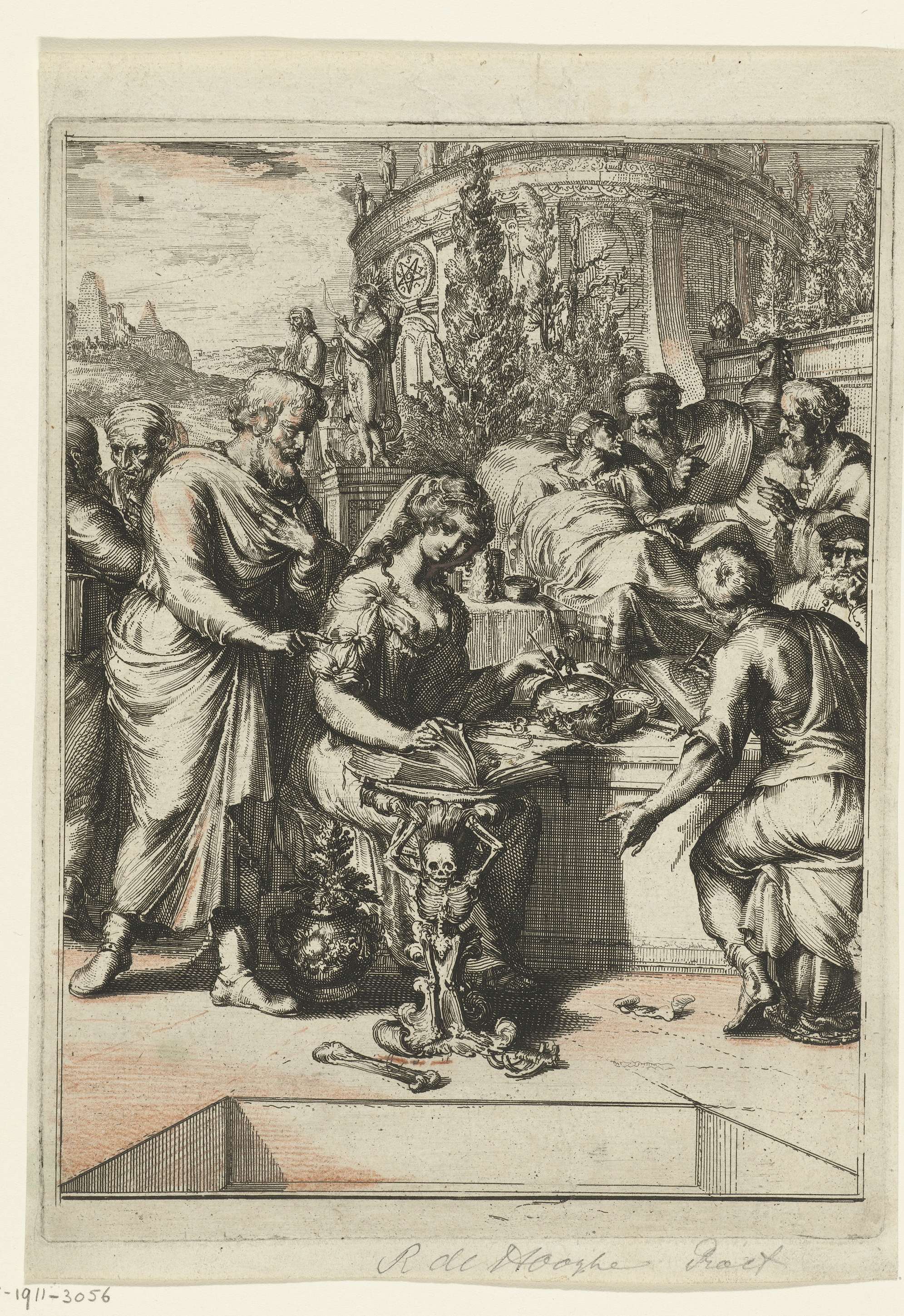 Allegorie op de geneeskunst. In het midden vrouw die in boek bladert en pen houdt bij hoofd dat door midden is gesneden. Rechts man die boek bekijkt (of illustreert) met afbeelding van doorsnede van het hoofd. Daarachter man op ziekbed met een piskijkende arts. Op achtergrond rond klassiek gebouw.