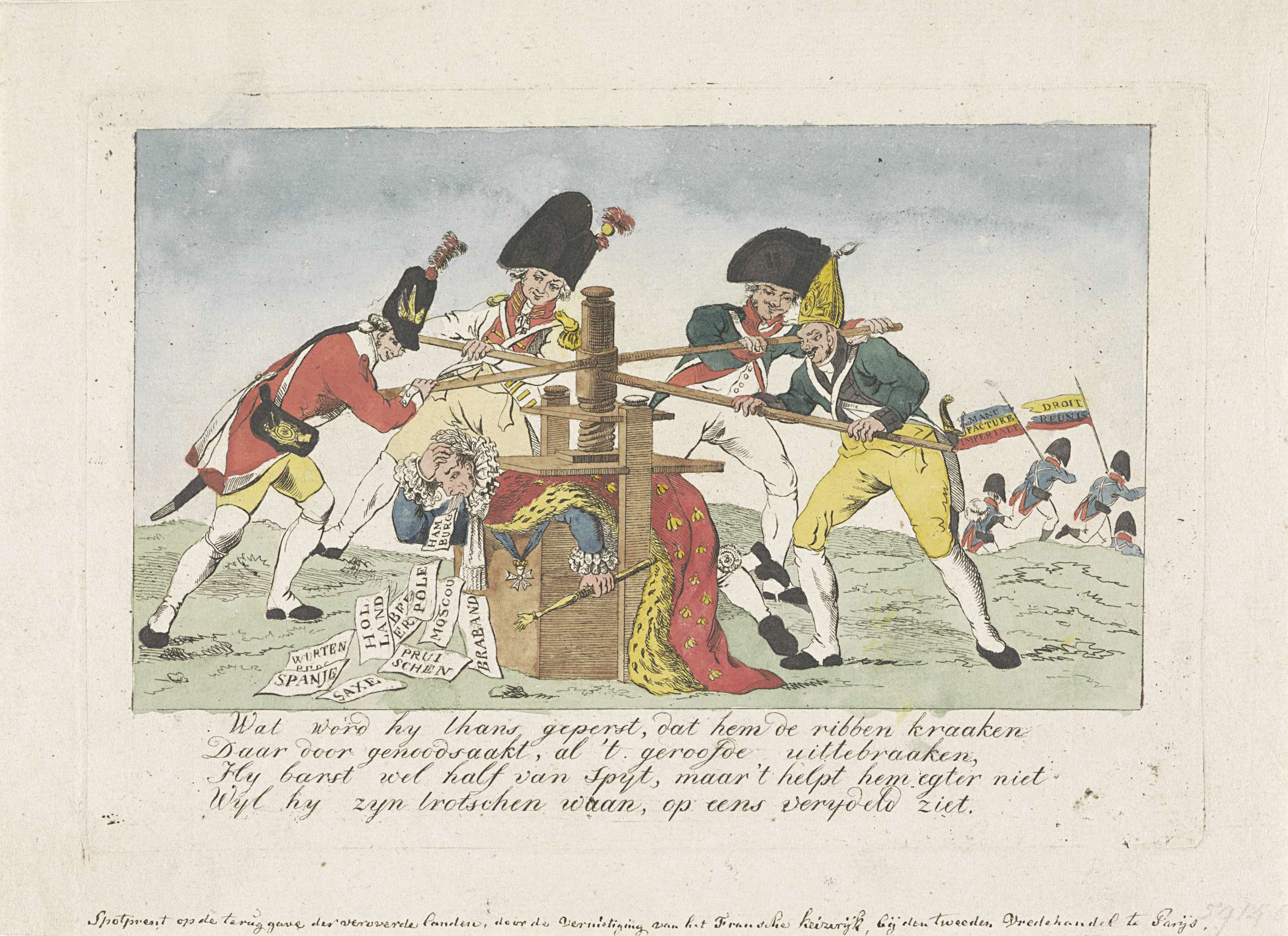 Spotprent op de val van Napoleon in 1813 en het verlies van veroverde landen, 1813. De keizer in keizersmantel ligt in een grote drukpers die aangedraaid wordt door een Oostenrijker, Engelsman, Pruis en een Rus. Napoleon spuugt briefjes uit met de namen van door de Fransen geannexeerde landen, waaronder Holland en Brabant. Op de achtergrond ...