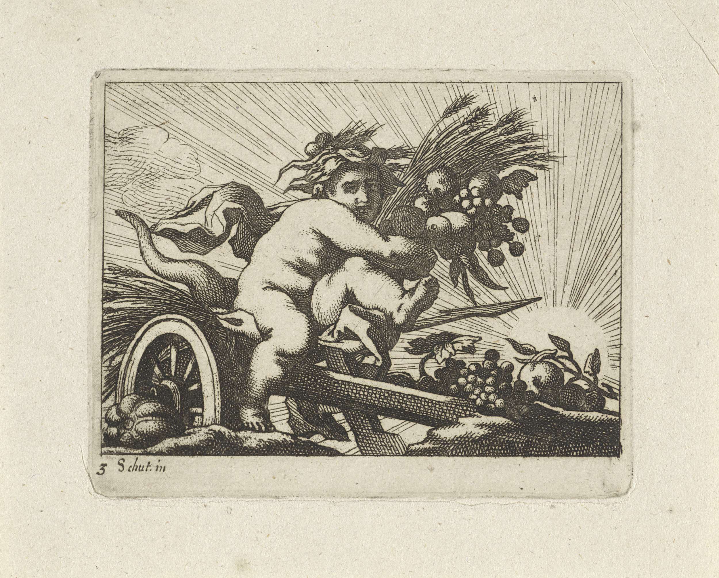 Een kind met zijn armen vol graanhalmen en fruit rijdt op een ploeg door de wolken.