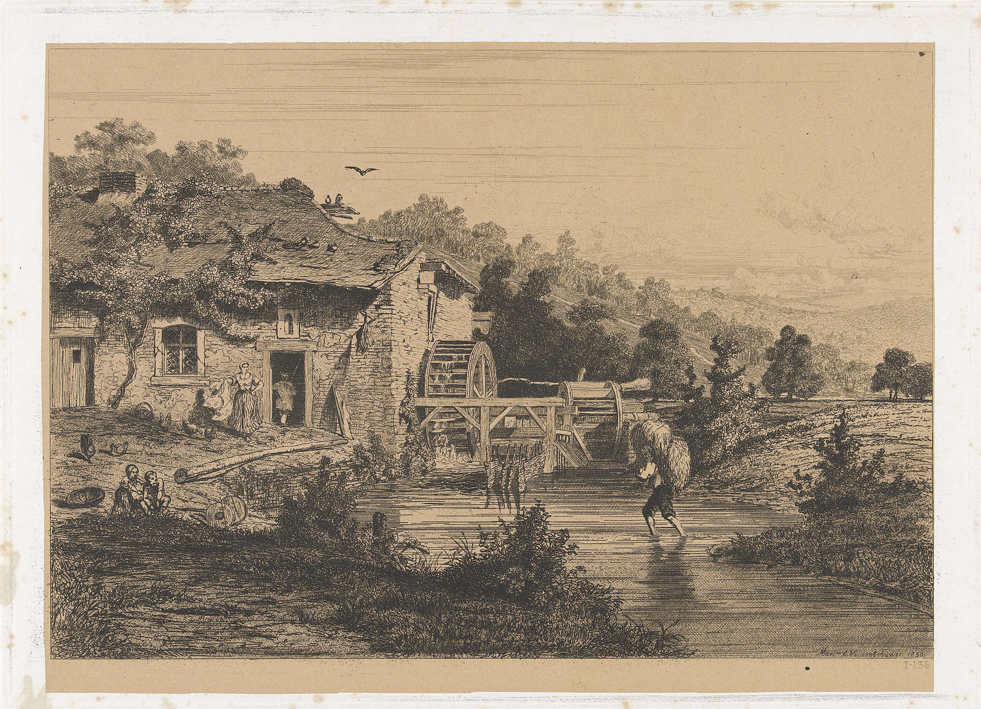 Landschap met een watermolen aan een beek. In de beek loopt een man met een baal hooi op zijn rug. Op het erf voor de molen staat een boerin en lopen een paar kippen. Aan de waterkant twee spelende kinderen.