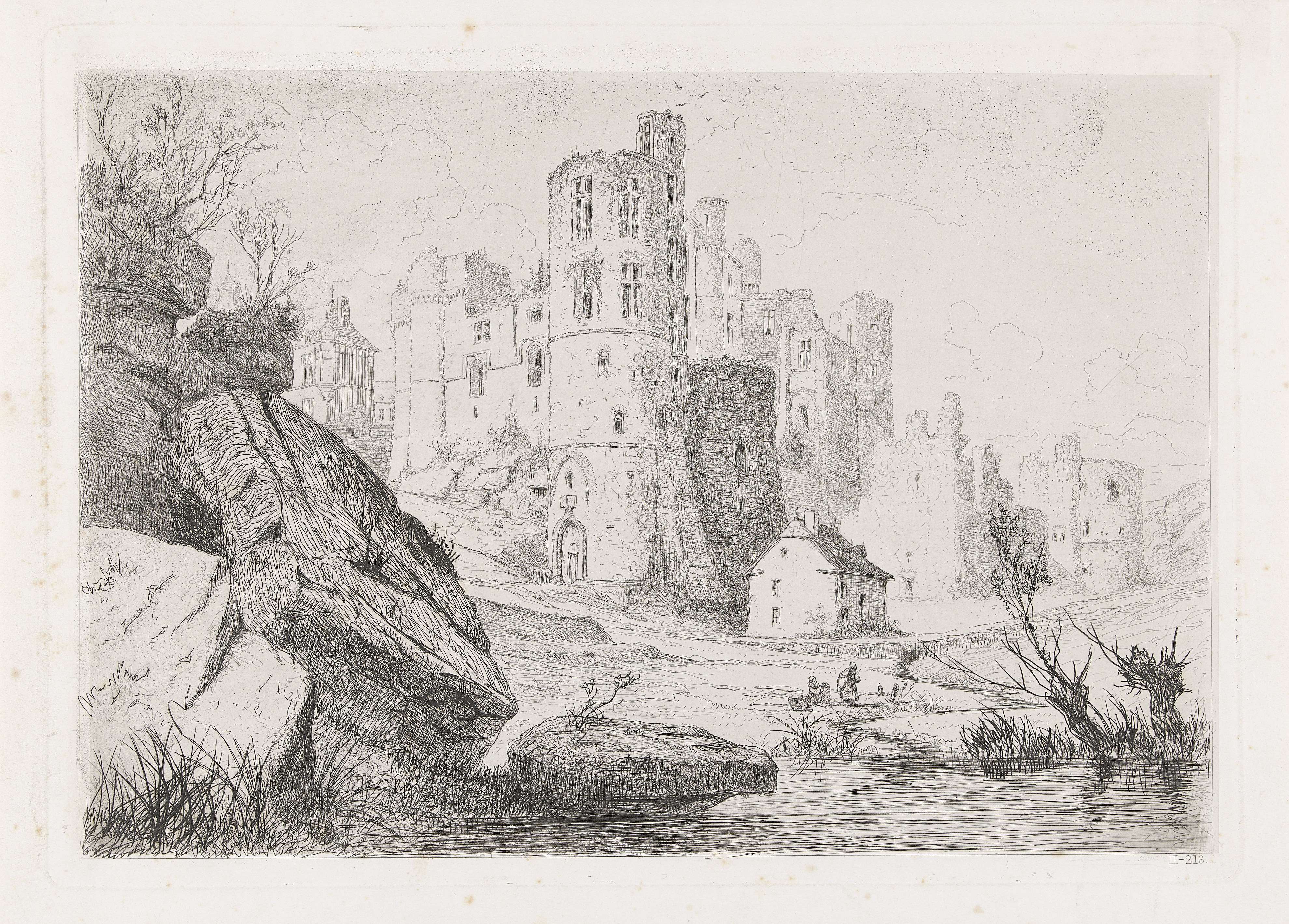 Gezicht op de aan het water gelegen ruïne van het kasteel van Beaufort. Voor de ruïne staat een klein huis en aan het water doen twee vrouwen de was.